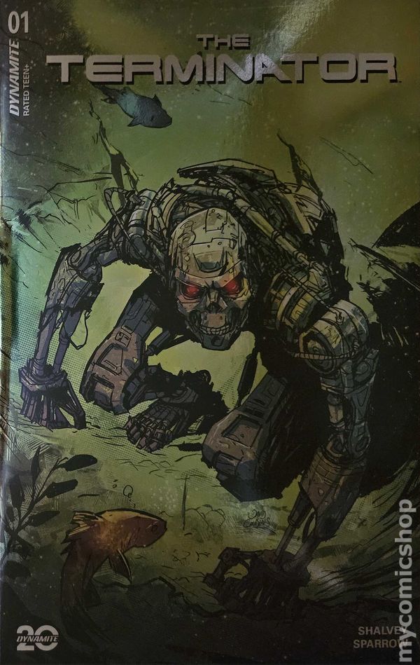 Limited 1 for 20 Retailer Incentive Variant Cover. Written by Declan Shalvey. Art by Luke Sparrow. Cover by Declan Shalvey. The plans to kill Sarah Connor and her son John have failed, but the genocidal Skynet isn't out of options yet. There are still a few more avenues into the past that will allow it to destroy the human resistance that is poised to smash its processors into silicon shrapnel - it just needs to expand its theater of operations. Opening a new front in the war, Terminators are dispatched across the globe and throughout time to target current resistance fighters, their ancestors, and anyone else unlucky enough to be in the strike zones. And while none of these secondary assignments are as straightforward as the missions of the first T-800 and T-1000, time is literally on the machines' side. When all of history becomes a war zone, nowhere - and nowhen - is safe! Acclaimed creator DECLAN SHALVEY (ThunderCats, Old Dog) returns to the present for another blockbuster Dynamite series, joining rising star artist LUKE SPARROW (Star Trek) for all-new tales of Skynet and its nigh-unstoppable mechanical assassins - all supported by algorithmically perfect covers from SHALVEY, EDWIN GALMON, SWAY, and DAVID COUSENS! ALL COVERS CARDSTOCK 32 pages, full color. Rated T+ Cover price $4.99.