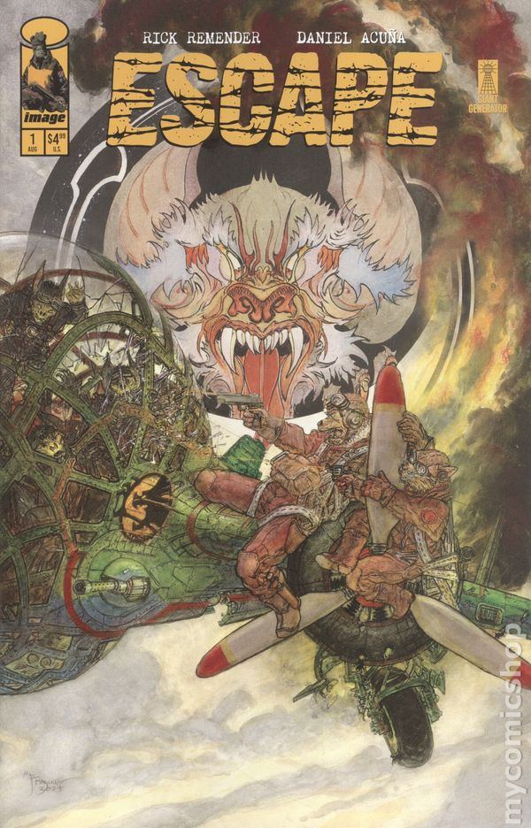 4th Printing. Written by Rick Remender. Art by TBD. SERIES PREMIERE SHOT DOWN. HUNTED. OUT OF TIME. THE NEW ONGOING TWO-FISTED WAR EPIC FROM REMENDER & ACUÑA STARTS HERE. From the creative team of**_ New York Times_** bestselling author RICK REMENDER (DEADLY CLASS, Uncanny X-Force) and powerhouse DANIEL ACUÑA (Captain America, Black Panther)—the duo behind Marvels **Uncanny Avengers**—comes a savage, full-throttle wartime thriller where survival isnt given…its taken. Milton Shaw is a battle-hardened bomber pilot, flying missions over a war-torn world ruled by a ruthless empire. But when his plane is shot out of the sky, Milton wakes up behind enemy lines—in the smoldering ruins of a city he helped burn. And in less than 24 hours, his own side is dropping the big one to finish the job. Now, injured, unarmed, and being hunted through enemy streets, Miltons only shot at escape comes from the unlikeliest place: a grieving father and his son—civilians shattered by the same fascist regime that rules this land with an iron claw. Enemies by blood. Allies by circumstance. Together, theyll have to fight their way out before the bomb drops and erases everything…and everyone. Set in a brutal, fully painted world of anthropomorphic animals—think Inglourious Basterds meets Blacksad—ESCAPE is a gritty, bullet-riddled journey through wars scorched aftermath. Its about the violence we inflict, the souls we try to save, and the courage it takes to crawl out of fire. 36 pages, full color. Rated T+ Cover price $4.99.