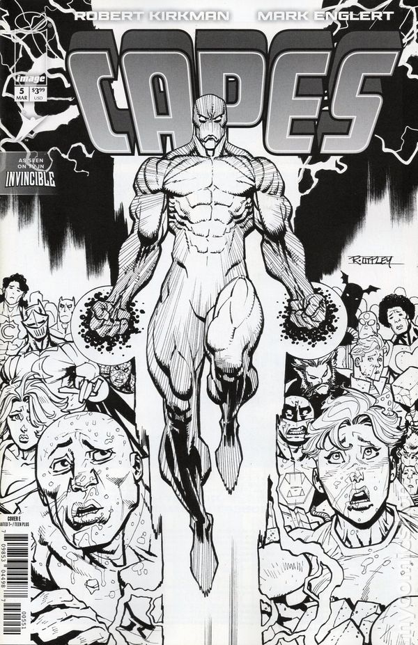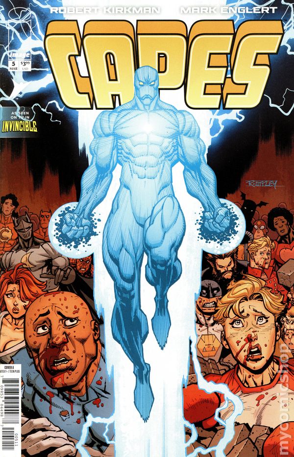 Limited 1 for 50 Retailer Incentive Variant Cover.(W) Robert Kirkman (A) Mark Englert (CA) Ryan Ottley NEW SERIES LONG OUT-OF-PRINT AND VERY IN-DEMAND! RE-INTRODUCING ROBERT KIRKMAN AND MARK ENGLERTS CORNER OF THE INVINCIBLE UNIVERSE! A special remastering of CAPES, featuring new art and dialogue! BOLT! KID THOR! KNOCK OUT! CAPTAIN COSMIC! CLAIRE VOYANT! BIG BRAIN! COMMANDER CAPITALISM! Welcome to Capes Inc, employers of your favorite super heroes that protect—well, at least when theyre on the clock—New York City from threats like MACHINE HEAD, TITAN...and now are in the crosshairs of an enemy they never expected! 32 pages, full color, rated teen+. Cover price $3.99.