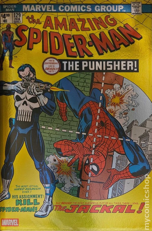 2025 Facsimile Foil Cover. $4.99 cover price. Written by Gerry Conway. Art by Ross Andru. Cover by Gil Kane. He's different…he's deadly…he's the Punisher! But why does he have Spider-Man in his sights? Find out as Frank Castle makes his mighty Marvel debut in an all-time classic from legendary creators Gerry Conway and Ross Andru! The Punisher's relentless war on crime has enthralled readers for decades - but it all began here, as the lethal vigilante is manipulated by the scheming Jackal into targeting Spidey! Frank only kills those who deserve to die - and he believes the "web-slinging menace" has earned just such a fate! Now, as Spider-Man and the Punisher clash for the first time, a rivalry for the ages is born! It's one of the all-time great Marvel comic books, boldly re-presented in its original form, ads and all! Reprinting AMAZING SPIDER-MAN (1963) #129. 32 pages, full color. Rated T Cover price $4.99.