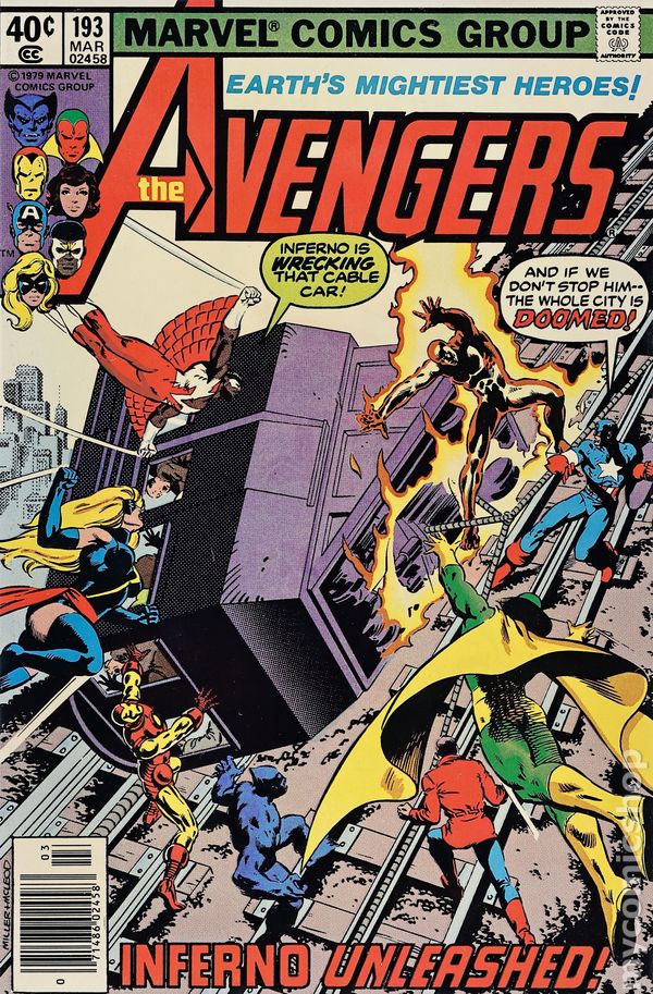 Newsstand Edition. "Battleground: Pittsburgh!" Part 2 of 2. Plot assist by the Pittsburgh Comix Club. Script by David Michelinie. Art by Sal Buscema (layouts), Dan Green (finishes), and Frank Miller (assists). Cover by Frank Miller and Bob McLeod. Inferno is on the loose in the Steel City! Wonder Man and Shell-head couldn't stop him! And now Captain America leads the rest of the Avengers to the Liberty Bridge to battle the fiery villain! But Inferno stays one step ahead of Earth's Mightiest Heroes and tears up the Duquesne Incline on his way to Mount Washington! Will the Avengers ever catch up to the raging Inferno? The letters page in Avengers 197 credits Frank Miller with assisting with the pencils. This issue includes a sideways full-page ad featuring Batroc the Leaper promoting Crazy Magazine. Letters page contains a statement of ownership: average print run 428,935; average paid circulation 217,850. 36 pgs. Cover price $0.40.
