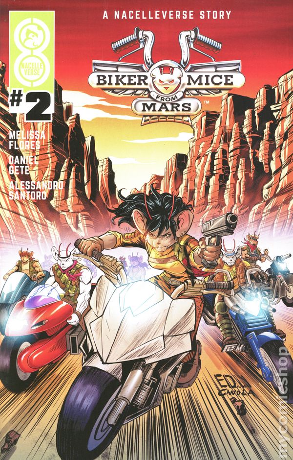 Written by Melissa Flores. Art by Francis Portela. Cover by Edu Souza, Ben Hunzeker. GET READY TO REV IT UP ON THE RED PLANET! Writer Melissa Flores (Mighty Morphin' Power Rangers, Spider-Gwen: Smash) and Francis Portela (Green Lantern) continue the exciting Nacelleverse saga! The Mars War has erupted, and our butt-kickin' heroes-Throttle, Vinnie, and Modo-are caught smack dab in the middle of it! As the ruthless Plutarkians continue their hostile takeover, the resident population finds itself under siege and at their mercy. With the planet in total chaos, who can the Biker Mice trust? Witness their biker beginnings as the myth of motorbike-riding, Martian mice starts here! How did Modo lose an eye? What happened to Vinnie's face? The answers are contained in this thrilling prequel chapter to the upcoming animated series! 28 pages, full color. Cover price $4.99.