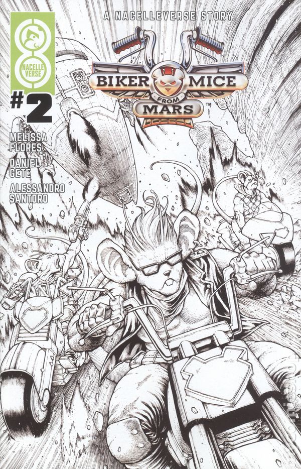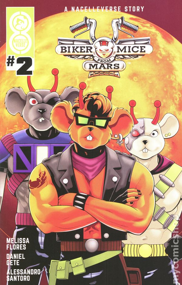 Written by Melissa Flores. Art by Francis Portela. Cover by Patrick Spaziante. GET READY TO REV IT UP ON THE RED PLANET! Writer Melissa Flores (Mighty Morphin' Power Rangers, Spider-Gwen: Smash) and Francis Portela (Green Lantern) continue the exciting Nacelleverse saga! The Mars War has erupted, and our butt-kickin' heroes-Throttle, Vinnie, and Modo-are caught smack dab in the middle of it! As the ruthless Plutarkians continue their hostile takeover, the resident population finds itself under siege and at their mercy. With the planet in total chaos, who can the Biker Mice trust? Witness their biker beginnings as the myth of motorbike-riding, Martian mice starts here! How did Modo lose an eye? What happened to Vinnie's face? The answers are contained in this thrilling prequel chapter to the upcoming animated series! 28 pages, full color. Cover price $4.99.