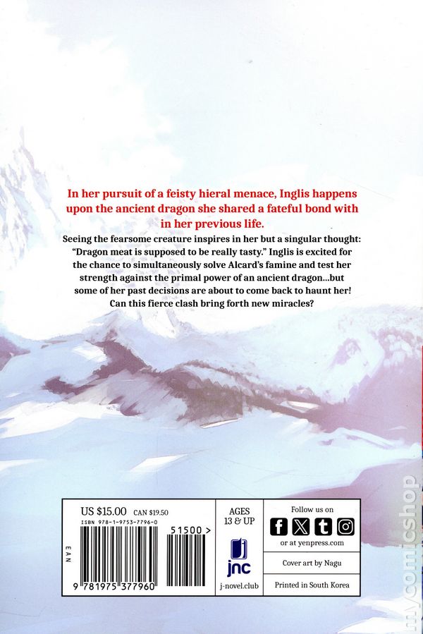 Volume 6 - 1st printing. Written by Hayaken. Art and cover by Nagu. Translated by Mike Langwiser. Inglis, once a hero-king and now a beautiful squire-in-training, is on a dangerous infiltration mission to avoid an all-out war with the snowy northern country of Alcard. As Alcards Prince Lahti leads the way, Ingliss sword arm and stomach alike call out for a northern tour of engaging fights and delicious food. But with Alcard under the oppressive rule of a hieral menace named Tiffanyer, Inglis is faced with her greatest enemy—hunger! You know, Rani, when I get mad about something, I get really mad. The wild north stirs before her! Softcover, 5-in. x 7-in., 148 pages, Text (with B&W Chapter Illustrations). Ages 13&up Cover price $15.00.