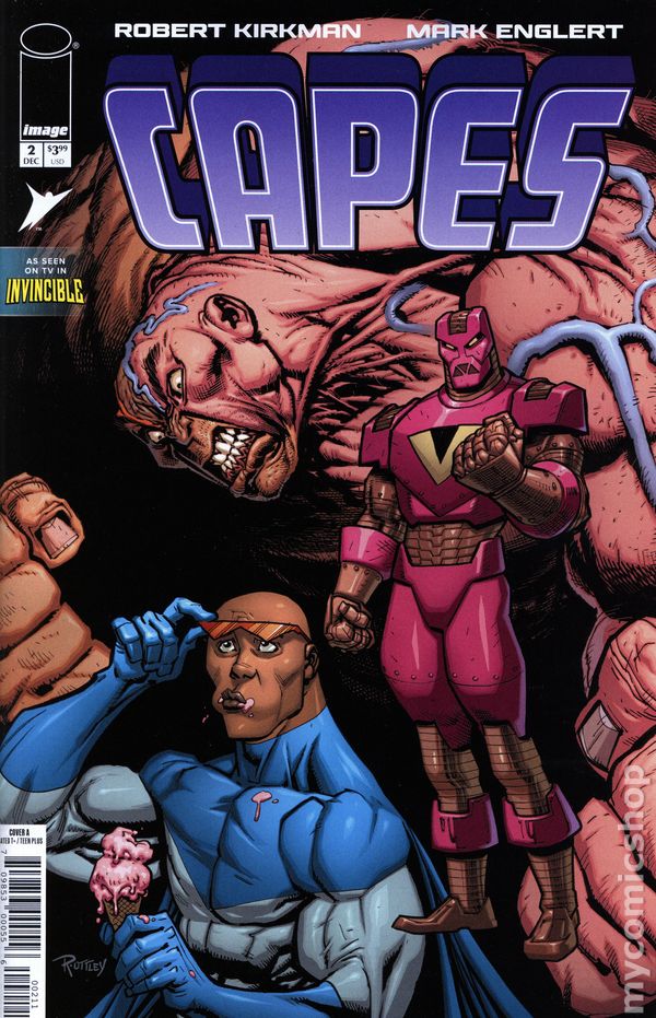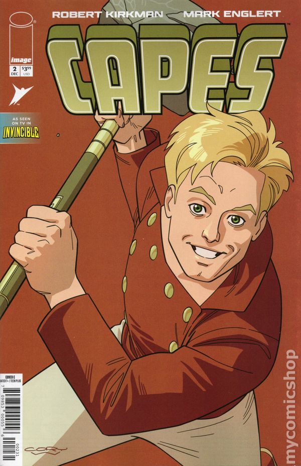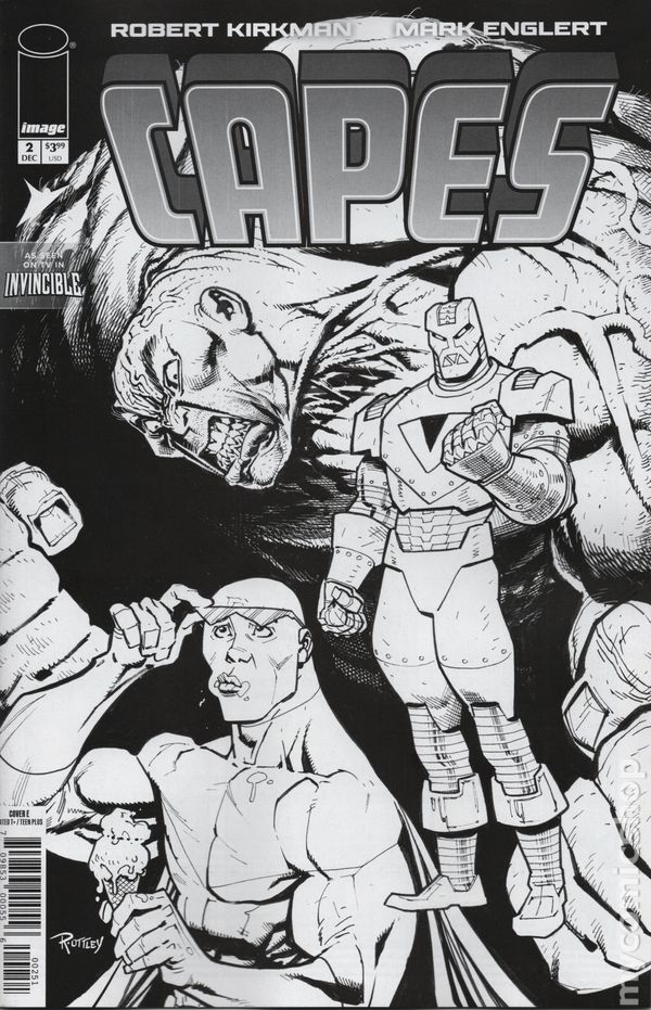 Limited 1 for 50 Retailer Incentive Variant Cover. (W) Robert Kirkman (A) Mark Englert (CA) Ryan Ottley REPRESENTING ROBERT KIRKMAN AND MARK ENGLERT’S CORNER OF THE INVINCIBLE UNIVERSE! A special remastering of CAPES, featuring new art and dialogue!    The city’s most dangerous super villains have escaped prison – and this time it’s personal for Bolt!    But who is targeting CAPES? And WHY? Cover price $3.99.