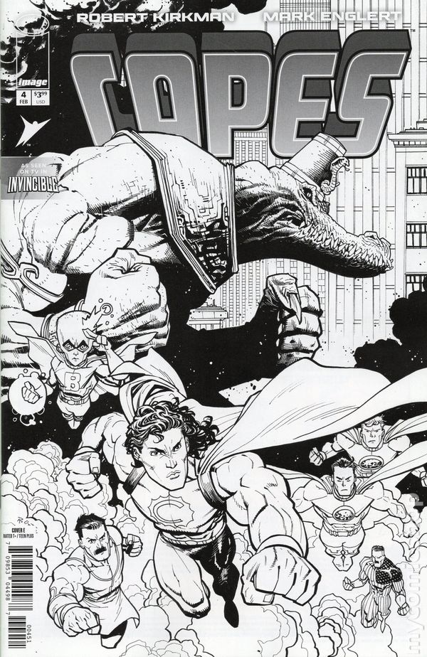 Limited 1 for 25 Retailer Incentive Variant Cover. (W) Robert Kirkman (A) Mark Englert (CA) Jahnoy Lindsay RE-PRESENTING ROBERT KIRKMAN AND MARK ENGLERTS CORNER OF THE INVINCIBLE UNIVERSE! A special remastering of CAPES, featuring new art and dialogue! CAPES Inc is still recovering after the events of the last issue... And Chronodile has returned to ensure they DON'T. 32 pages, full color, rated T+. Cover price $3.99.