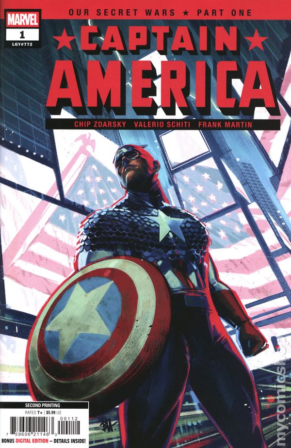 2nd Printing. Written by Chip Zdarsky. Art by Valerio Schiti. Cover by Ben Harvey. A NEW ERA FOR CAPTAIN AMERICA BEGINS HERE! While Captain America slumbered in ice, the world changed - for better and for worse. Steve Rogers awakens to a reality where battles are fought in the shadows through secrets and subterfuge, and villains aren't so easy to identify. When a fledgling dictator named Victor Von Doom conquers Latveria, Steve faces a critical decision: adapt to a new kind of warfare, or forge his own path? And what will the choice he makes in the past mean for his future? Experience the untold tale of Captain America's first encounter with Doctor Doom as Chip Zdarsky and Valerio Schiti team up for a game-changing new era of CAPTAIN AMERICA! 40 pages, full color. Rated T+ Cover price $5.99.