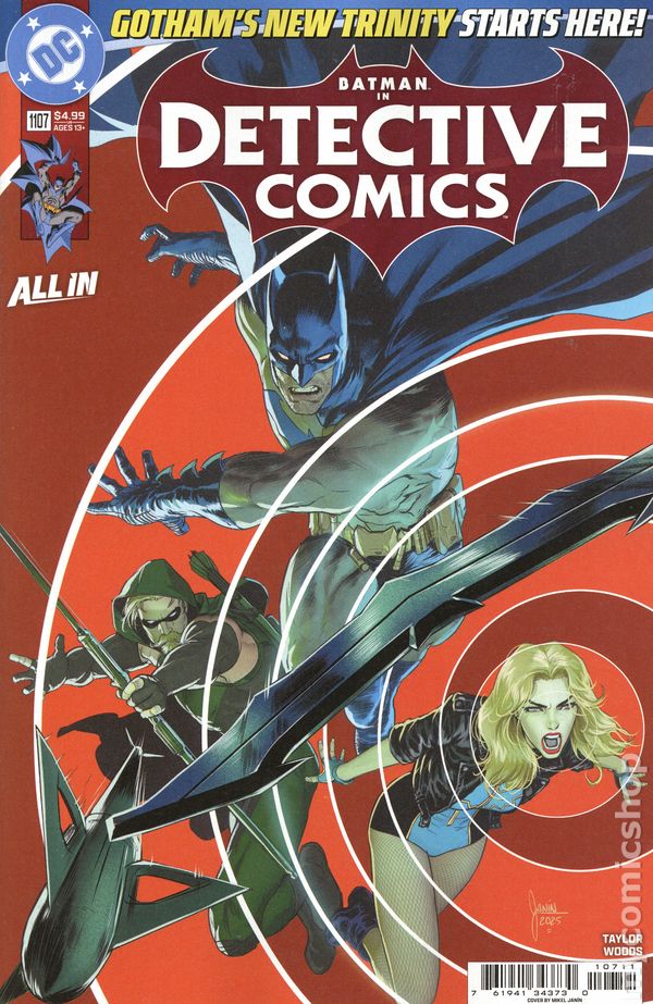 (W) Tom Taylor (A) Pete Woods (CA) Mikel Janin GUEST-STARRING GREEN ARROW AND BLACK CANARY! The Dark Knight Detective is hot on the trail of an abducted teenager with a mysterious past, but he has found himself at a dead end. In a rare moment of desperation, Batman teams up with Black Canary and Gotham City’s newest resident, Green Arrow, to investigate a case with unexpected and terrifying implications for Bruce, Dinah, and Oliver’s shared history. Will this trio be enough to rescue this girl and unravel the mystery of her past? Find out in this thrilling new storyline! Cover price $4.99.