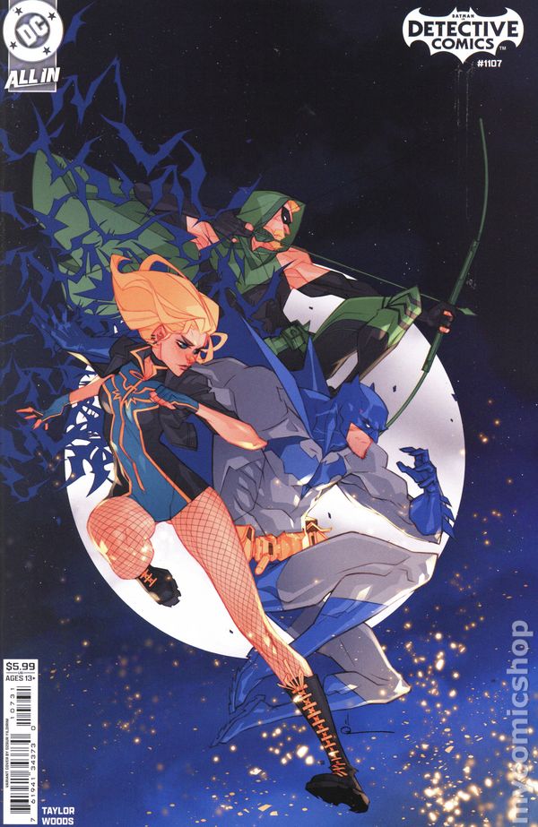 (W) Tom Taylor (A) Pete Woods (CA) Jorge Jimenez GUEST-STARRING GREEN ARROW AND BLACK CANARY! The Dark Knight Detective is hot on the trail of an abducted teenager with a mysterious past, but he has found himself at a dead end. In a rare moment of desperation, Batman teams up with Black Canary and Gotham City’s newest resident, Green Arrow, to investigate a case with unexpected and terrifying implications for Bruce, Dinah, and Oliver’s shared history. Will this trio be enough to rescue this girl and unravel the mystery of her past? Find out in this thrilling new storyline! Cover price $7.99.