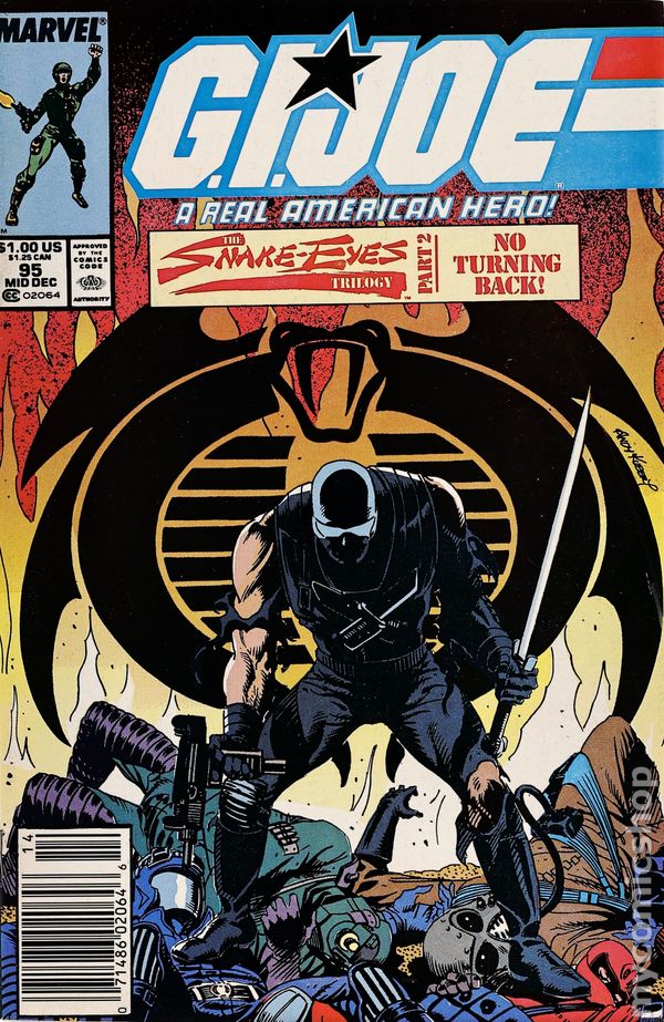 View scanNewsstand Edition. "The Snake-Eyes Trilogy: Part 2 - No Turning Back!" Snake-Eyes is chained up and about to be tortured; Scarlett is in a coma; Destro stops by for a surprise visit to the Baroness; the Baroness pretends that everything is fine and she doesn't have the Joe's resident ninja tied up in the basement; the Joes and Storm Shadow move in for a rescue, but Snake-Eyes has plans of his own. Characters: FEATURE: G.I. Joe--Hawk; Snake-Eyes; Scarlett; Doc; Lifeline; Roadblock; Chuckles; Stalker; GUESTS: Wade Collins; Storm Shadow; Blind Master; Billy; VILLAINS: Destro; Baroness; Scrap-Iron; Raptor; Vipers; Night Viper; Crimson Guard; Paine Brothers--Crispo; DeSade; Torquemada; Dr. Hundtkinder; CAMEO: J. Jonah Jameson. Written by Larry Hama, with art by Mark Bright and Randy Emberlin. Cover by Andy Kubert. Cover price $1.00.