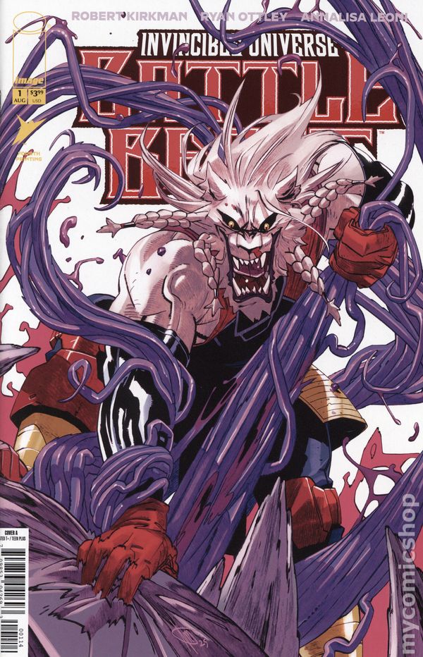 2nd Printing. Cover C. Written by Robert Kirkman. Art by Ryan Ottley, Annalisa Leoni. Cover by Ryan Sook. Series Premiere. The best new (not quite a) super-hero series in the universe! Cursed with an unquenchable thirst for violence, Battle Beast searches the universe for the one warrior mightier than him-and a glorious death, his only reward. But even in a universe of mighty Viltrumites like Invincible and Omni-Man, it seems that no one may be able to stop the galaxy's deadliest warrior... unless he does the unthinkable. Superstars Robert Kirkman and Ryan Ottley present the most demanded Invincible story of all time, revealing the secret story of Battle Beast that's perfect for any long-time fan (no spoilers!) and new readers alike. 40 pages, full color. Rated T+ Cover price $3.99.