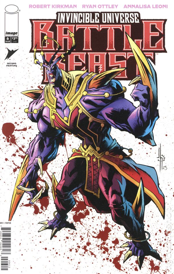 2nd Printing. (W) Robert Kirkman (A) Ryan Ottley, Annalisa Leoni (CA) Jason Howard **END OF STORY ARC ** Battle Beast goes to war. A looming threat emerges, one longtime fans of **INVINCIBLE **will recognize. 32 pages, full color, rated teen+. Cover price $3.99.
