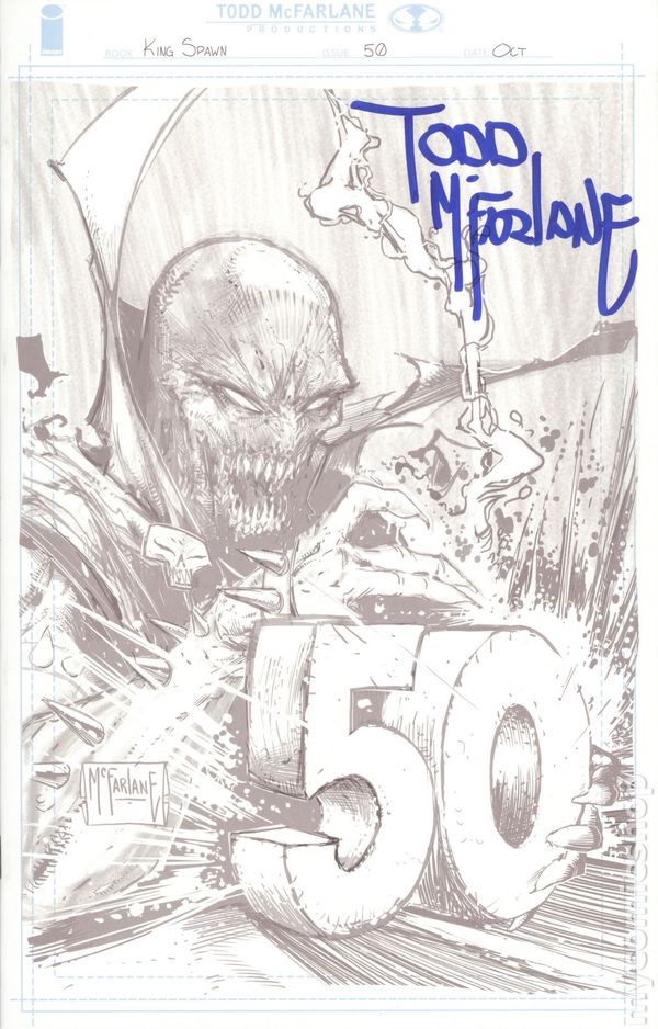 Limited 1 for 1000 Retailer Incentive Variant Cover. (W) Rory McConville, Todd McFarlane (A) Stephen Segovia, Carlo Barberi (CA) Todd McFarlane Four years ago, Todd McFarlane launched the first large-scale expansion of the Spawn Universe with King Spawn #1. Now we are here to celebrate the success of the expanded Spawn's Universe with King Spawn #50. An oversized issue with a story that will cross over into all three of the #50's coming out in the coming months. (King Spawn, Gunslinger Spawn, The Scorched). An ancient force, almost as old as time itself, has returned, and Spawn is in its sights. The story, sent into two chapters per issue, will be penciled by two of the Spawn Universe's best, Stephen Segovia and Carlo Barberi. NOTE: This incentive was sent by the publisher as two items- an original sketch on its own sheet of art board AND a variant signed by Todd McFarlane. This listing will ONLY include copies of the signed comic. Cover price $4.99.
