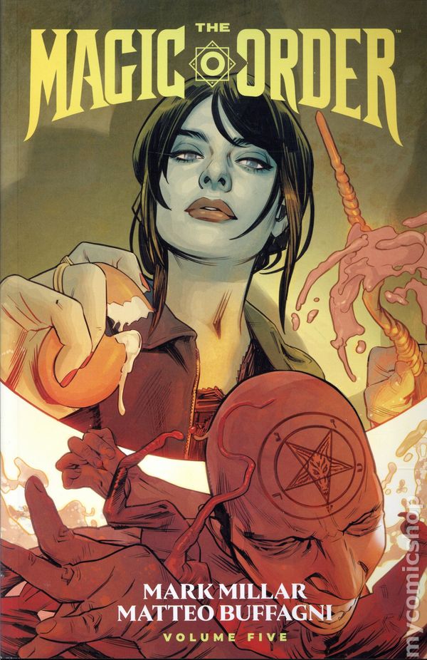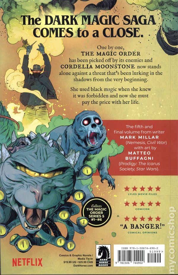 Volume 5 - 1st printing. Collects The Magic Order 5 (2024 Dark Horse) #1-6. Written by Mark Millar. Art and Cover by Matteo Buffagni. Soon to be a major Netflix live action series, this volume of The Magic Order concludes the adult fantasy story about a family of wizards who look after the world and protect us from the creatures lurking in the dark. A lifetime of bad decisions finally catches up with the woman who protects the entire world from the forces of darkness. They've protected mankind for a thousand years, but one by one they've been picked off by their enemies since Cordelia Moonstone used black magic and now she's the last wizard standing as they make their final push. Softcover, 160 pages, full color. Mature Readers Cover price $19.99.