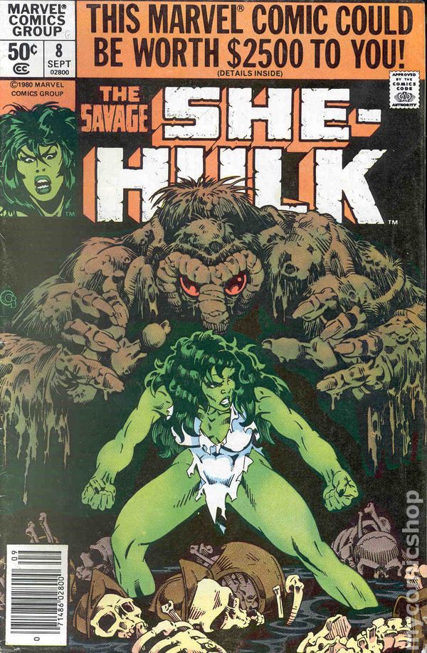 Newsstand Edition. "Among the Ogres!" Part 2 of 2. Guest-starring the Man-Thing. Story by David Anthony Kraft. Art by Mike Vosburg and Chic Stone. Cover by Michael Golden. At the mercy of bizarre swamp dwellers, can She-Hulk escape before their mysterious liquid disfigures her making her as grotesque as they are? Plus, the macabre Man-Thing emerges from the murky swamp, but is he friend or foe? Cover price $0.50.