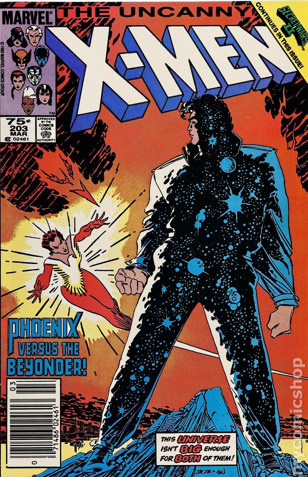 Canadian Edition with $.95 cover price. Secret Wars II tie-in. - "Crossroads!" Starjammers cameo. Story by Chris Claremont. Art by John Romita, Jr. and Al Williamson. Phoenix continues her ill-fated quest to destroy the Beyonder. When the X-Men have the chance to end the Beyonder's threat forever, what decision will they make. Cover price $0.95.