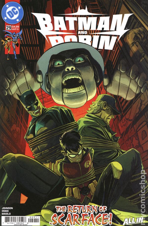 (W) Phillip Kennedy Johnson (A) Fico Ossio (CA) Nimit Malavia THE RETURN OF SCARFACE! Arnold Wesker had been thought cured--he'd left the Ventriloquist moniker behind and started a new life. But now his ol' pal Scarface is back, and he's pulling Wesker's strings once again. Meanwhile, Batman and Robin find themselves at odds over how to handle the recently apprehended Quiet Man, who may have more in common with Batman than it seems. A convergence of evil is on the horizon--will Batman and Robin be able to work together to stop it? Cover price $4.99.