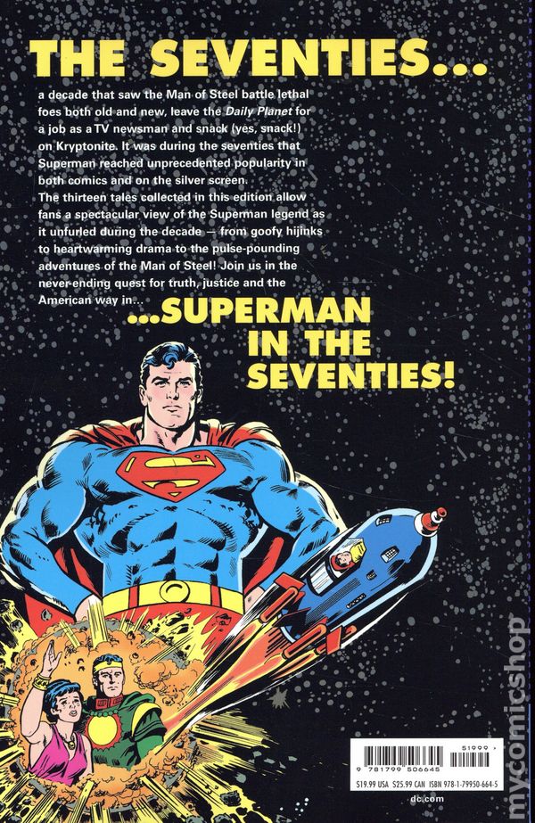 2nd Edition - 1st printing. Collects stories from Superman (1939-1986 1st Series) #233, 238, 247-249, 270-271, 276, 286-287, 298, and 300; Action Comics (1938-2011 DC) #436, 466, 484, 491, and 494; DC Comics Presents (1978-1986 DC) #14, Superman's Pal, Jimmy Olsen (1954-1974) #133; and Superman's Girlfriend (1958-1974) #106. Written by Denny O'Neil, Len Wein, Cary Bates, Elliot S! Maggin, Paul Levitz, and Robert Kanigher. Art by Curt Swan, Murphy Anderson, Dick Dillin, Jack Kirby, Werner Roth, Bob Oksner, Vince Colletta, Tex Blaisdell, Joe Giella, Frank Chiaramonte, Dick Giordano, and Al Plastino . Cover art by Neal Adams. A decade that saw the Man of Steel battle lethal foes both old and new, leave the Daily Planet for a job as a TV newsman, and snack (yes, snack!) on Kryptonite. The 13 tales collected in this edition allow fans a spectacular view of the Superman legend as it unfurled during the decade--from goofy hijinks to heartwarming drama to the pulse-pounding adventures of the Man of Steel! Join us in the never-ending quest for truth, justice, and the American way in Superman in the Seventies! Softcover, 224 pages, full color. Cover price $19.99.