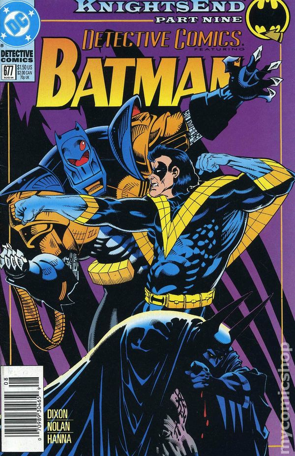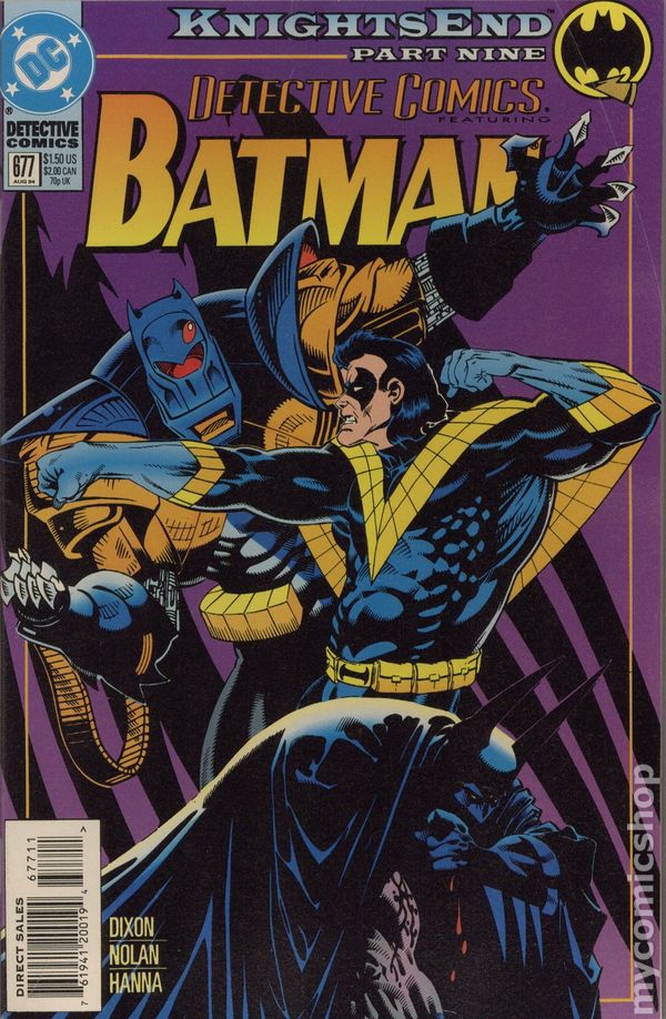 Direct Edition. Part 9 of the 12-part KnightsEnd: The burning shards of Bruce Wayne's Batmobile rain on a savage battle between Nightwing and Batman, with Robin helpless to stop it. Continued from Batman Shadow of the Bat (1992) #30. Continues in Batman Legends of the Dark Knight (1989-2007) #63. Written by Chuck Dixon, with art by Graham Nolan and Scott Hanna. Cover by Kelley Jones. 36 pgs. Cover price $1.50.