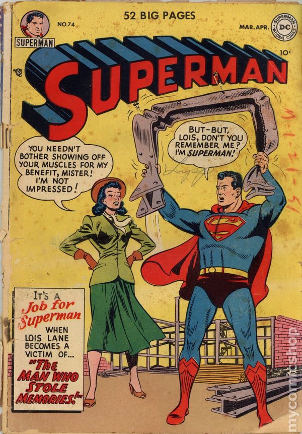 Misprinted Edition with #74 on cover. Cover art by Al Plastino. The Prankster's Star Pupil starring Superman and The Prankster, script by Edmond Hamilton, pencils by Wayne Boring, inks by Stan Kaye. Superman--Thrill Salesman, script by Edmond Hamilton, art by Al Plastino. So You Want To Be a G-Man? text story. The Man Who Stole Memories starring Superman, Moose Collins, and Professor Higgins, script by Bill Woolfolk; Lois Lane suffers temporary amnesia. Full-page ad for the feature film "Superman and the Mole Men." 52 Pages, Full Color. Cover price $0.10.