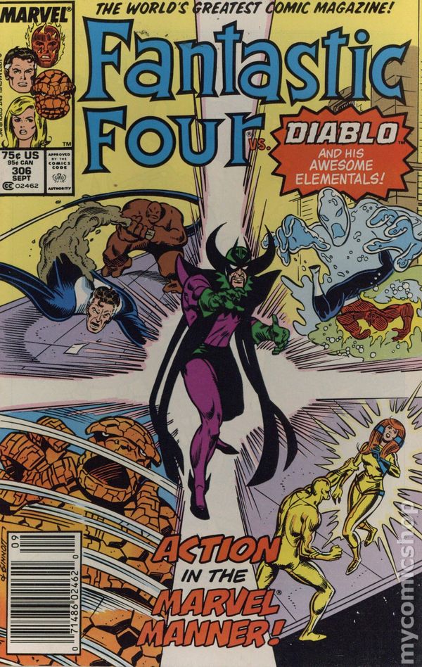Newsstand Edition. "The Marvel Rage!" Guest-starring the Inhumans. Story by Steve Englehart. Art by John Buscema and Joe Sinnott. Ms. Marvel (aka Sharon Ventura) arrives in New York City just in time to save the FF from Diablo! Could she become the next member of the Fantastic Four? Cameo appearance by Captain America. 36 pages. Cover price $0.75.