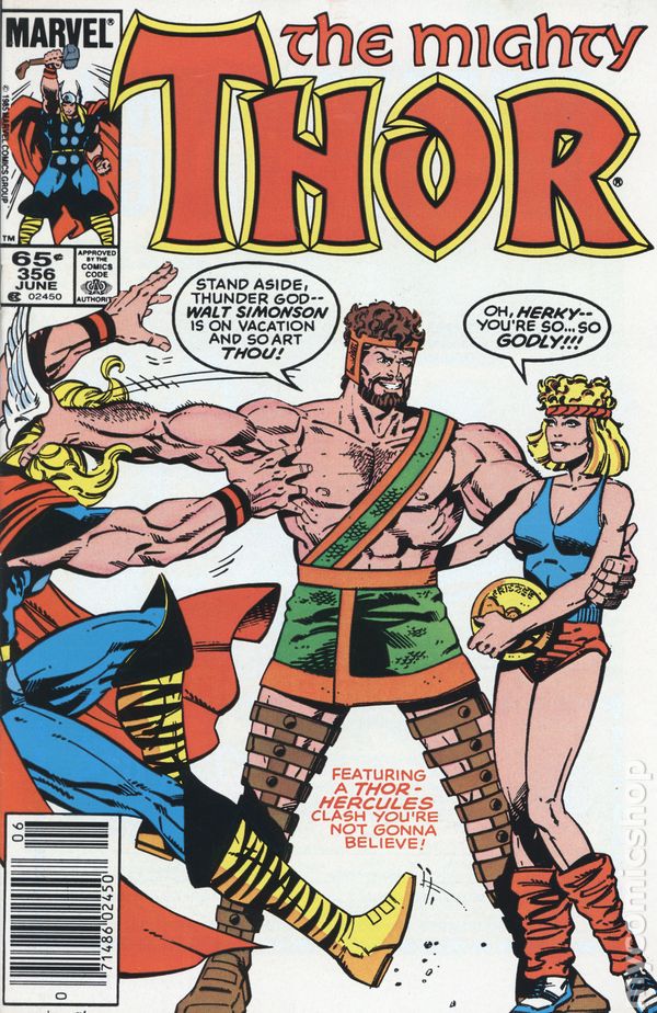 Newsstand Edition. Cover pencils by Bob Layton, inks by Jackson Guice. "The Power and the Pride," script by Bob Harras, pencils by Jackson Guice, inks by Bob Layton; Hercules tries to resolve a dispute between some boys as to who is stronger, he or Thor; embellishment ensues. Bullpen Bulletins. 36 pgs., full color. $0.65. Cover price $0.65.