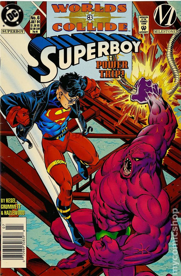Newsstand Edition. Worlds Collide: Part 3. "Changing Realities!" Guest-starring Superman. Story by Karl Kesel. Art by Tom Grummett and Doug Hazlewood. Story continued from Hardware (1993) #17. Superboy must face his biggest challenge yet when he goes toe-to-toe with the Parasite, a creature that has almost killed the Man of Steel on several occasions. Plus, Superboy meets Fred Bentson from the Milestone Universe in this special crossover event. Story continues in Icon (1993) #15. Cover price $1.50.