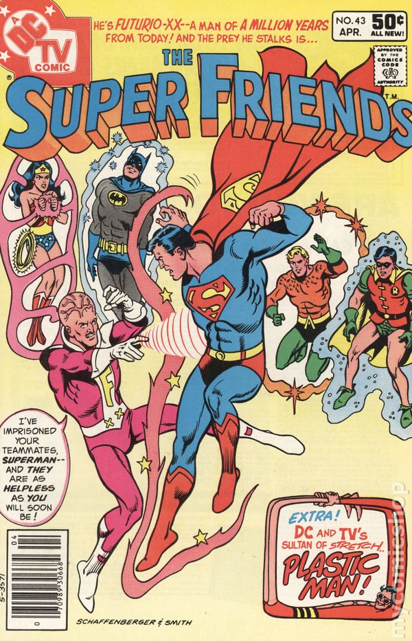 Newsstand Edition. "Futurio Times Ten." Futurio-XX, the Overlord's futuristic clone, wants a clone of Wonder Woman as a mate, but can't bring himself to kill the Super Friends. Starring Aquaman, Batman, Robin, Superman, Wonder Woman, Zan, and Jayna. Script by E. Nelson Bridwell, pencils by Romeo Tanghal, inks by Vince Colletta. Cover by Kurt Schaffenberger and Bob Smith. Cover price $0.50.