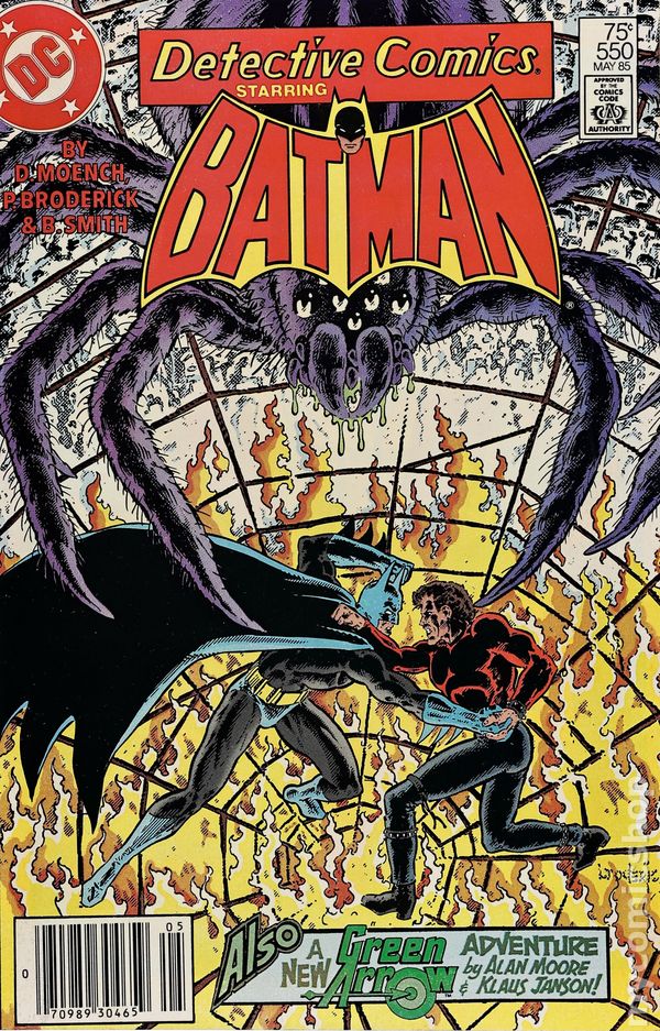 Newsstand Edition. Cover by Pat Broderick. "The Spider's Ninth Leg!", script by Doug Moench, pencils by Pat Broderick, inks by Bob Smith; The nine critical steps in Joey Redwine's life are replayed as Batman chases the criminal across the Gotham rooftops. "Night Olympics, Part Two," script by Alan Moore, art by Klaus Janson; Green Arrow goes after the archer that shot Black Canary. Statement of ownership: average # of copies per issue, previous year—77,275. 36 pgs., full color. $0.75. Cover price $0.75.