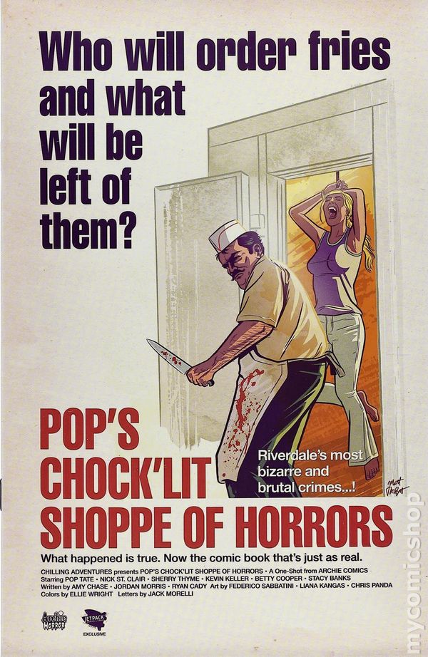 Jetpack Comics and Games Exclusive Variant Cover by Matt Talbot - limited to 250 copies. Written by Amy Chase & Various. Art by Frederico Sabbatini & Various. CHILLING ADVENTURES PRESENTS... POP'S CHOCKLIT SHOPPE OF HORRORS O.S. Pop Tate is the glue holding Riverdale together, whether everyone realizes or not. His Chocklit Shoppe is the beating heart of the city, where everyone can stop in for a delicious bite and some safe haven-even the worst sorts. And not just the run-of-the-mill rapscallions who recently broke the jukebox. When a young Riverdale couple (Nick St. Clair and Sherry Thyme) attempt to dine and dash on the humble small business owner, they quickly discover the fryer grease isn't the only heart-stopping thing about the Chocklit Shoppe. From tales of mystery meat to the unnatural visitors that dine late at night, this anthology tells stories about the horrors that happen at Riverdale's beloved malt shop-and how Pop Tate is at the center of it all, the most powerful figure in Riverdale providing haven to all sorts of terrors and underhanded villainy. 32 pages, full color. Rated T+