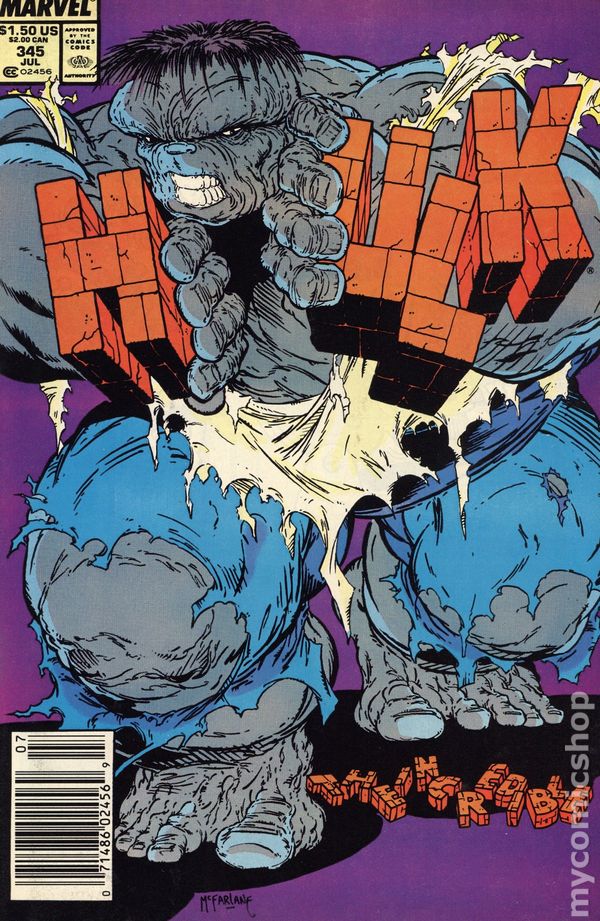 Newsstand Edition. Special extra-sized issue. "Turning Point!" Story by Peter David. Art by Todd McFarlane, Jim Sanders III, and Chris Ivy. The last two years have been building to this issue. Welcome to Middletown, a quiet little hamlet. It's citizens are like any other small town with aspirations and problems of their own. Enter: the Hulk. The Hulk and his companions have tracked down the Leader and the only thing standing in the Grey Behemoth's way is Redeemer and Rock, the super-powered former Hulkbusters. Witness the ultimate confrontation between the Hulk and one of his oldest enemies, and Middletown is caught in the middle. The ending of this one will absolutely shock you. 52 pages. Cover price $1.50.