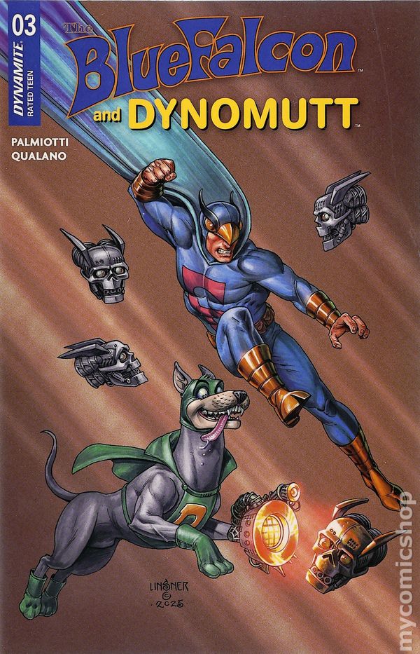 (W) Jimmy Palmiotti (A) Pasquale Qualano (CA) Joseph Michael Linsner DYNOMUTT UNLEASHED! In this issue: After saving a bus full of civilians from a deadly explosion, a critically injured Blue Falcon is rushed to the hospital — leaving him vulnerable to retaliation from the criminal elements he has been targeting so effectively. One villain in particular is determined to have her vengeance on Big Citys cowled defender. But the furious feline power of Beastwoman is about to meet its match in the form of a new, augmented, and cybernetically enhanced Dynomutt! Dogs best friends JIMMY PALMIOTTI and PASQUALE QUALANO answer the call of the wild in The Blue Falcon & Dynomutt #3 — featuring best-in-show covers from LUCIO PARRILLO, AMANDA CONNER, JOSEPH MICHAEL LINSNER, and FRANCESCO MATTINA! 32 pages, full color, rated teen. Cover price $4.99.