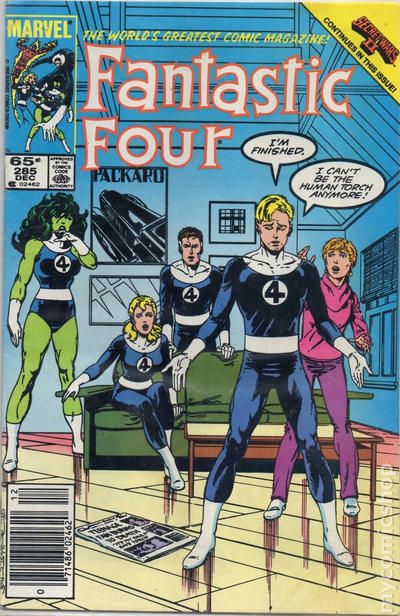 Newsstand Edition. Secret Wars II tie-in. "Hero!" Avengers cameo. Story by John Byrne. Art by John Byrne and Al Gordon. Cover by John Byrne. Don't miss one of the most important and poignant Fantastic Four tales. When a little boy tries to emulate his hero the Human Torch, Johnny learns a hard lesson about what it means to be a role model. In the tragic aftermath of the boy's death Johnny loses his will to be the Human Torch. Plus, what role does the Beyonder play in this drama? 36 pgs. Cover price $0.65.