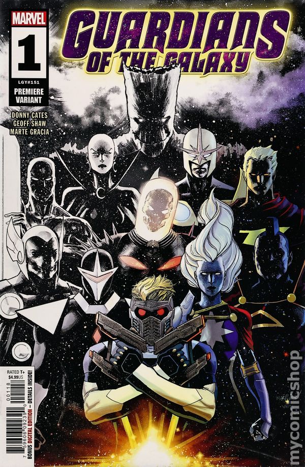 "Premiere" Edition Partial B&W Sketch Variant Cover by David Marquez. Written by Donny Cates. Art by Geoff Shaw. WHO WILL STAND The universe is on fire. Hundreds of worlds are at war. Never has there been such hatred and division across the cosmos. And in spite of all this, Thanos of Titan is still dead…or is he? Now, more than ever, the cosmos need the Guardians of the Galaxy…but in the aftermath of the Infinity Wars, who is left to answer the call? Featuring every cosmic super hero in the known universe by the THANOS WINS creative team of Donny Cates and Geoff Shaw! Rated T+ Cover price $4.99.