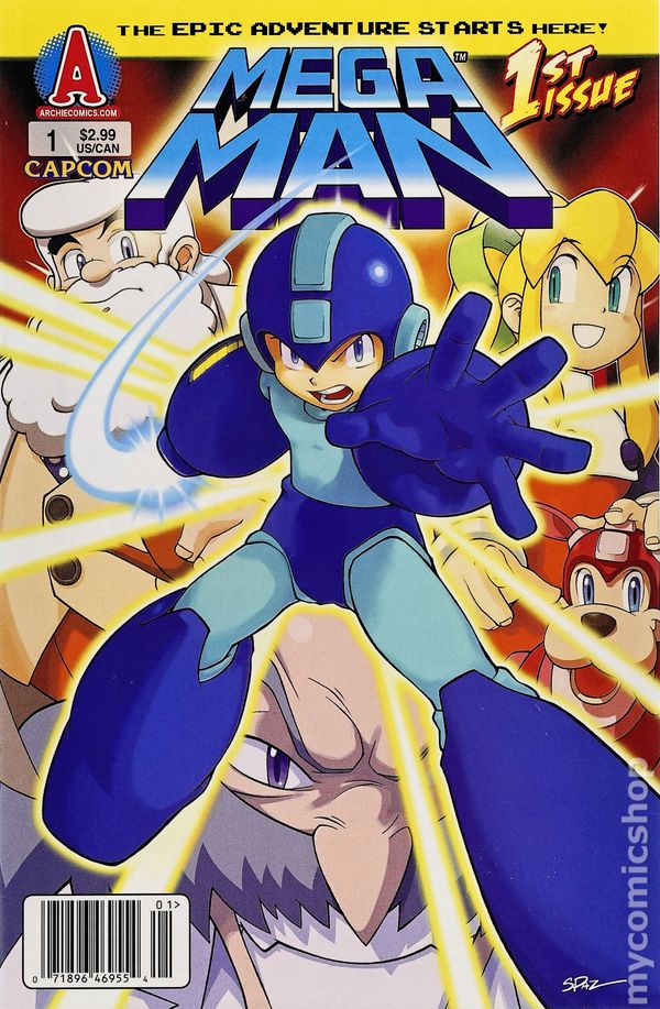 Newsstand Edition. Cover by Patrick 'Spaz' Spaziante. Let the Games Begin!: Part 1 of 4 - (W) Ian Flynn (A) Patrick 'Spaz' Spaziante 'Let the Games Begin!' Part One. The future looks bright when brilliant and benevolent Dr. Light unveils his latest creations: the Robot Masters! But when the nefarious Dr. Wily steals them for his own sinister purposes, there is no one left to stop him. No one - except Mega Man! Don't miss the first issue of this brand new ongoing series based on Capcom's long-running and best-selling video game sensation! Cover price $2.99.