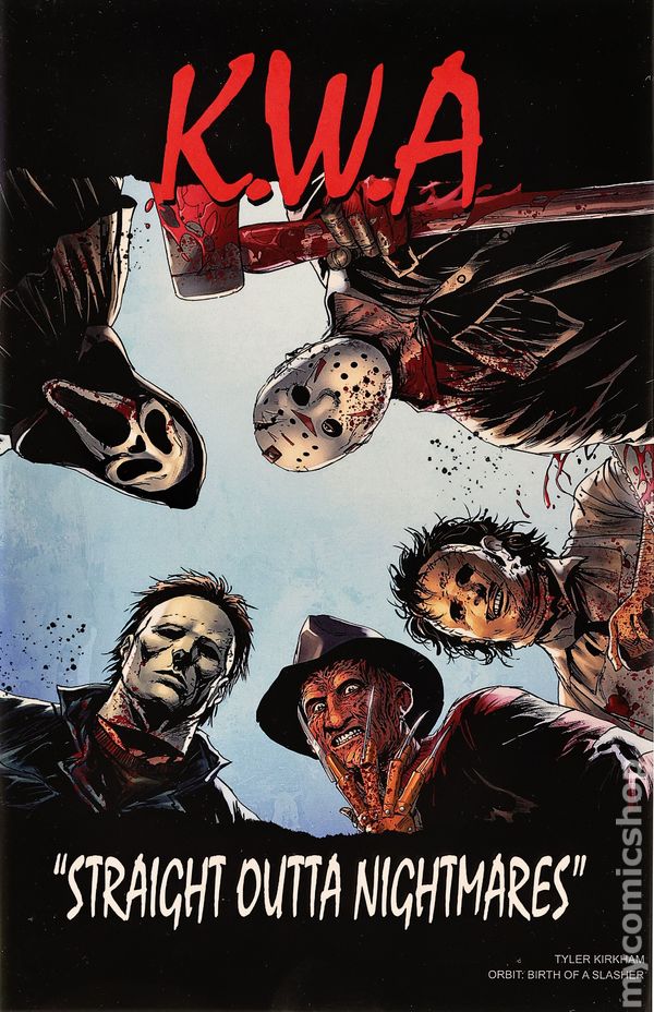 Variant Cover by Tyler Kirkham. Cover homage to "Straight Outta Compton" album cover. Story by Michael Frizell. Art by Martin Gimenez. Slashers made horror iconic - and Orbit: Birth Of A Slasher is your VIP pass to every masked maniac, final girl, and epic scream that changed pop culture forever. From Psycho's first shocking stab to Friday the 13th's endless carnage and Scream's meta mayhem, we slice through the legends, the rip-offs, the reboots, and the blood-drenched blockbusters that made fear fashionable. Meet the killers who ruled the box office and the survivors who flipped the script. Packed with behind-the-scenes facts, unforgettable moments, and killer artwork, this is a fast, fierce ride through six decades of guts, gore, and glory. Whether you're team Freddy, Jason, or Ghostface-this history lesson cuts deep.