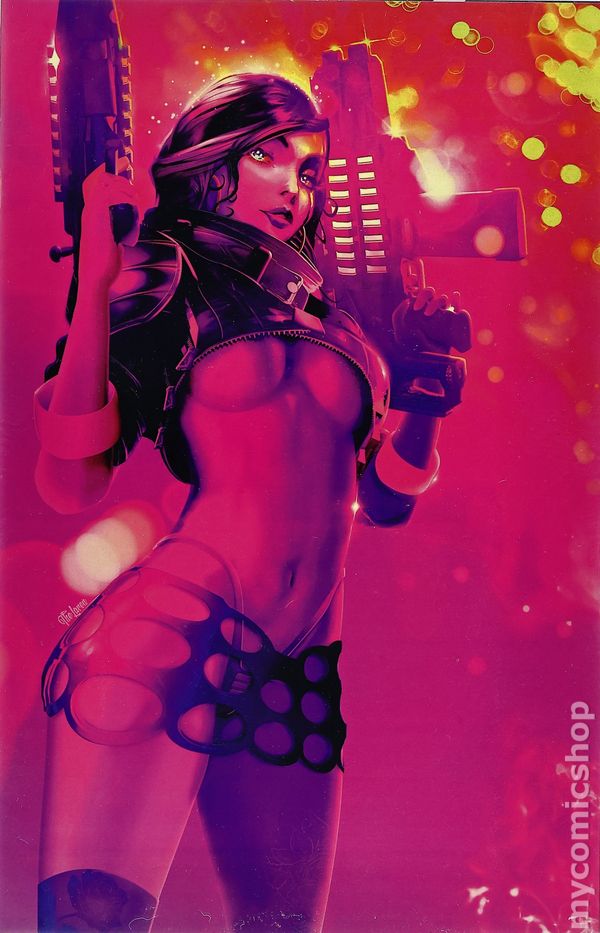 "Android Minxx" Edition Virgin Cover by Hal Laren. Story by Pat Shand. Art by Romano Molenaar. Minxx is a mercenary for hire. Her attitude is pretty much: do the job no matter how dirty, get the money, and never think about the consequences. However, one thing that Minxx isn't is a psychotic murderer… at least, that's what she says. In the last season, she was arrested for the murder of a law enforcement officer which she denies. Thing is? Its caught on tape. A baffled Minxx manages to escape, and soon discovers the source of her woes when she runs into an exact replica of herself.