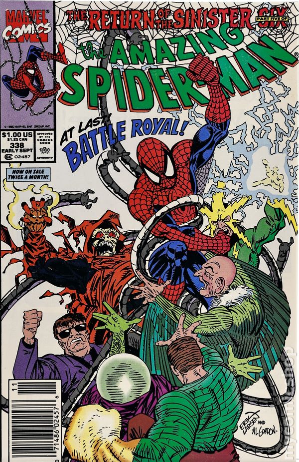 Newsstand Edition. "Death from Above!" The Return of the Sinister Six Part 5 of 6. Script by David Michelinie. Pencils by Erik Larsen. Inks by Mike Machlan. Cover by Erik Larsen and Al Gordon. At last, the Sinister Six make their move! Just minutes before Cordco's satellite launches into outer space, Dr. Octopus and his partners in crime storm the control center! If Doc Ock loads his poison-filled canisters on the satellite, the whole planet will be in jeopardy! Unfortunately, by the time the web-slinger arrives at the launch pad; the Hobgoblin, Vulture, Mysterio, and Electro are running amok! But what about the Sandman? Would he help Spider-Man stop the launch? Time is running out! Cameo appearances by Mr. Fantastic, Aunt May, Jonathan Caesar, and Mary Jane Watson. 36 pages. $1.00 cover price. Cover price $1.00.