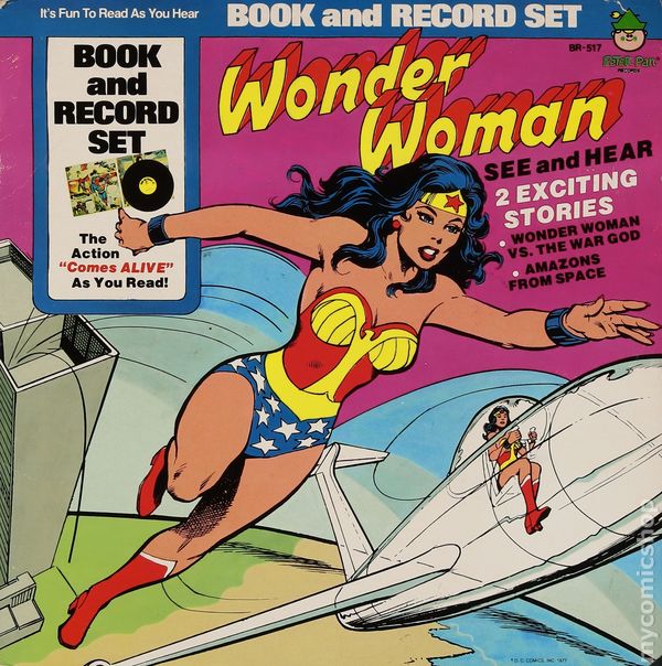 Record Included - Wonder Woman in 2 exciting stories "Wonder Woman Vs. The War God" and "Amazons From Space" 20-page full color comic with 45 record. 12.25" x 12.25" inches with cardstock cover and white non-gloss interior paper stock.