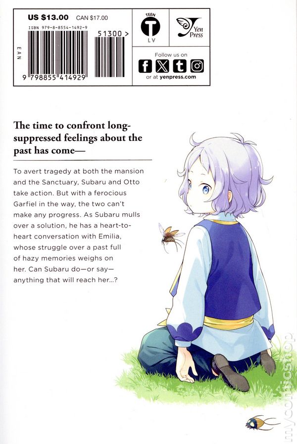 Volume 9 - 1st printing. Based on the Story by Taooei Nagatsuki. Adapted by Yu Aikawa. Art by Haruno Atori. Cover by Enoki Tomoyuki. Translated by Jeremiah Bourque. The time to confront longsuppressed feelings about the past has come — To avert tragedy at both the mansion and the Sanctuary, Subaru and Otto take action. But with a ferocious Garfiel in the way, the two cant make any progress. As Subaru mulls over a solution, he has a heart-toheart conversation with Emilia, whose struggle over a past full of hazy memories weighs on her. Can Subaru do—or say— anything that will reach her…? Softcover, 5-in. x 7-in., 204 pages, B&W. Age 13+ Cover price $13.00.