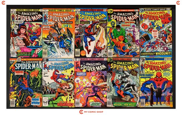 Issues 376, 377, 381-387, 388B of Amazing Spider-Man (1963 1st Series). Most will grade in the VF- to VF/NM range.
