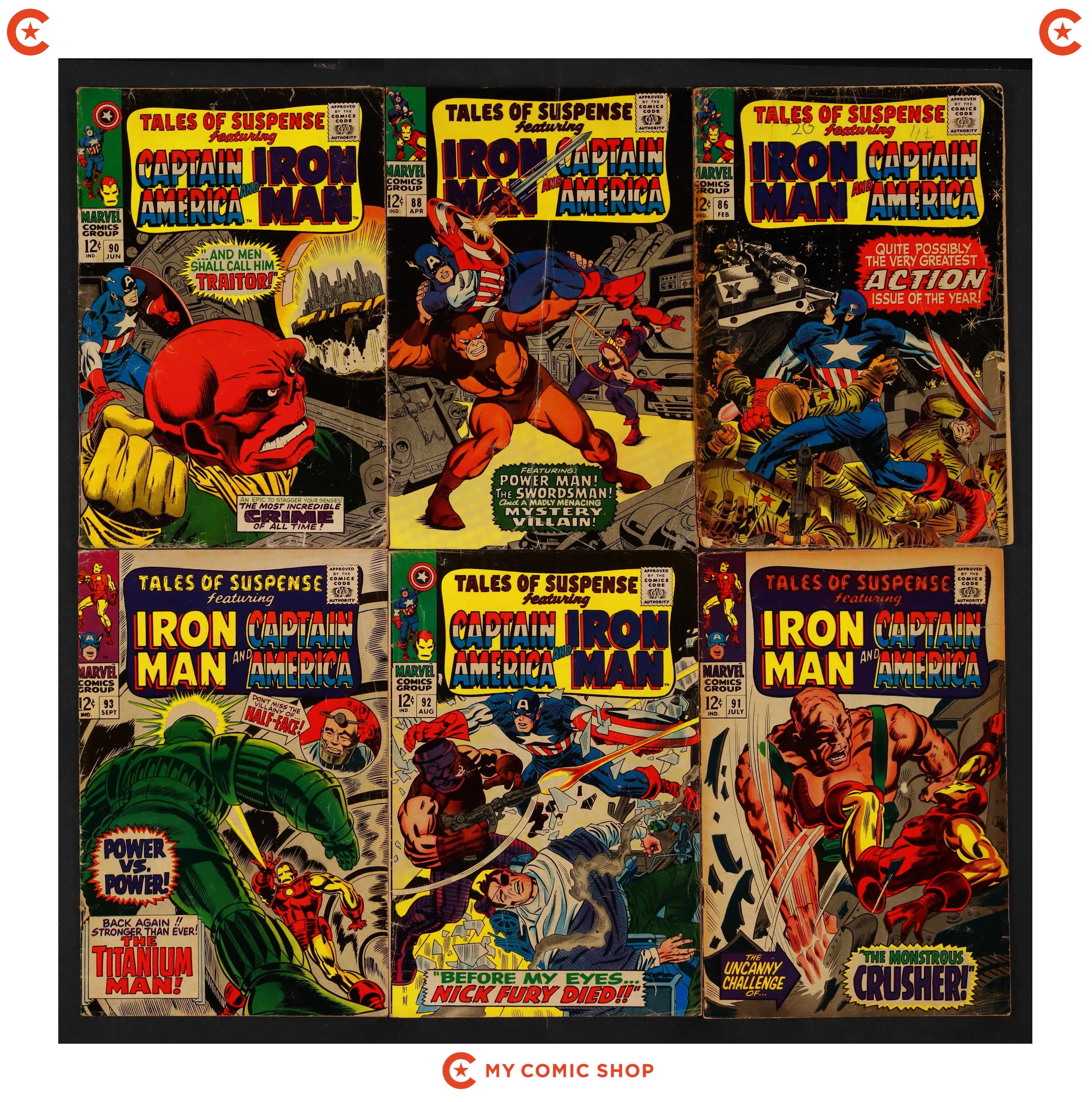 Issues 71, 76, 81, 83, 85, 87, 88, 89, and 91 of Tales of Suspense (1959). Most will grade in the FN range with some grading VG.