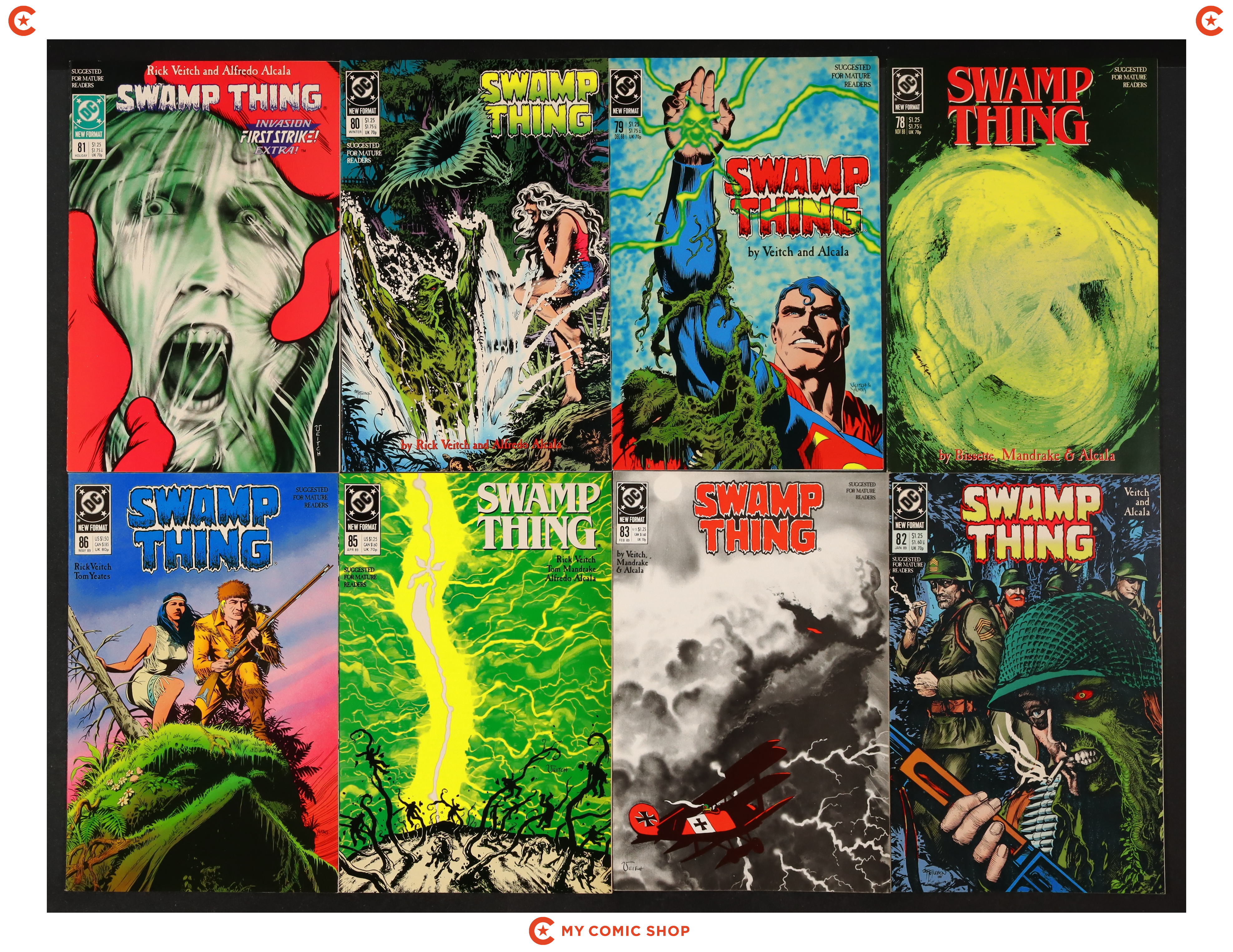 Issues 78-83, 85-89 of Swamp Thing (1982 2nd Series). Most will grade in the FN- to VF+ range.