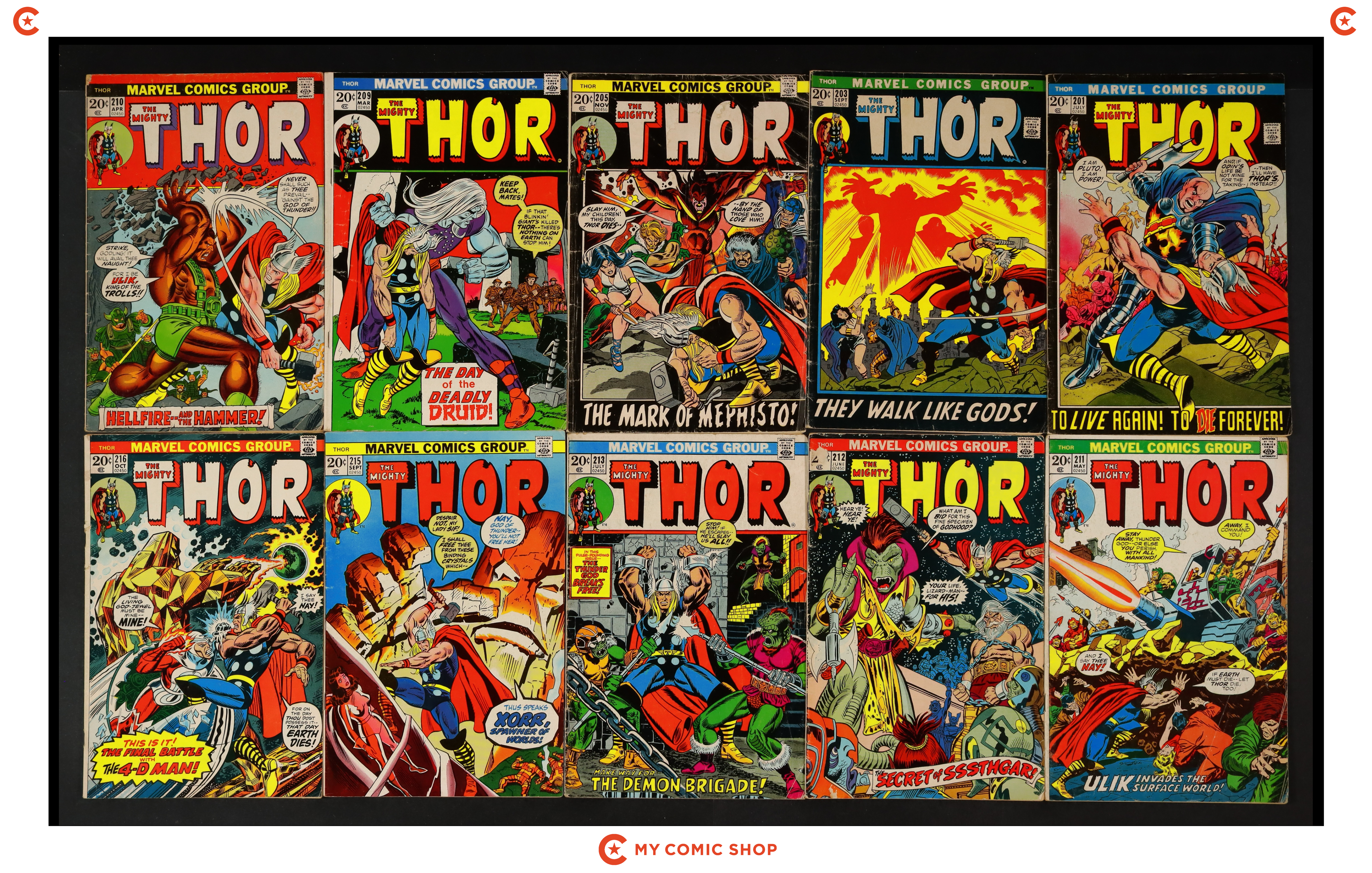 Issues 201, 203, 205, 209-213, 215, and 216 of Thor (1962 Marvel 1st Series Journey Into Mystery). Most will grade in the VG to GD range.