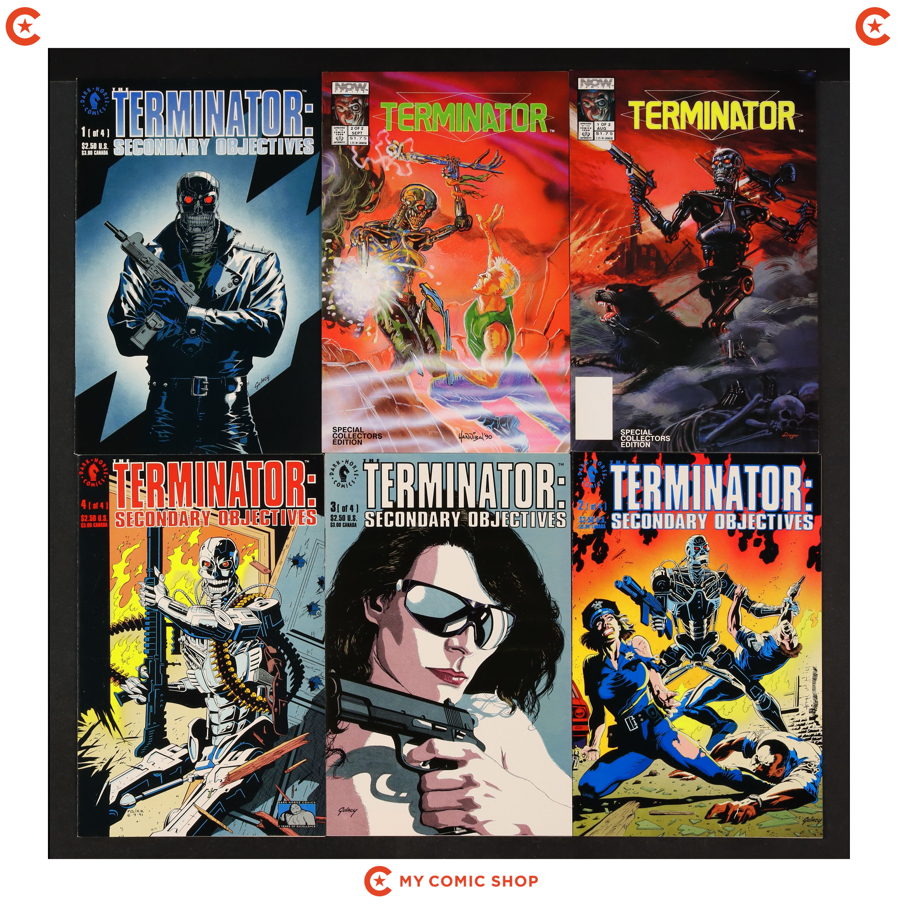 Issues 1 and 2 of Terminator All My Futures Past (1990); 1-4 of Terminator Secondary Objectives (1991); and 1-4 of Terminator (1990 1st Series Dark Horse). Most will grade in the VF range with a couple grading FN.