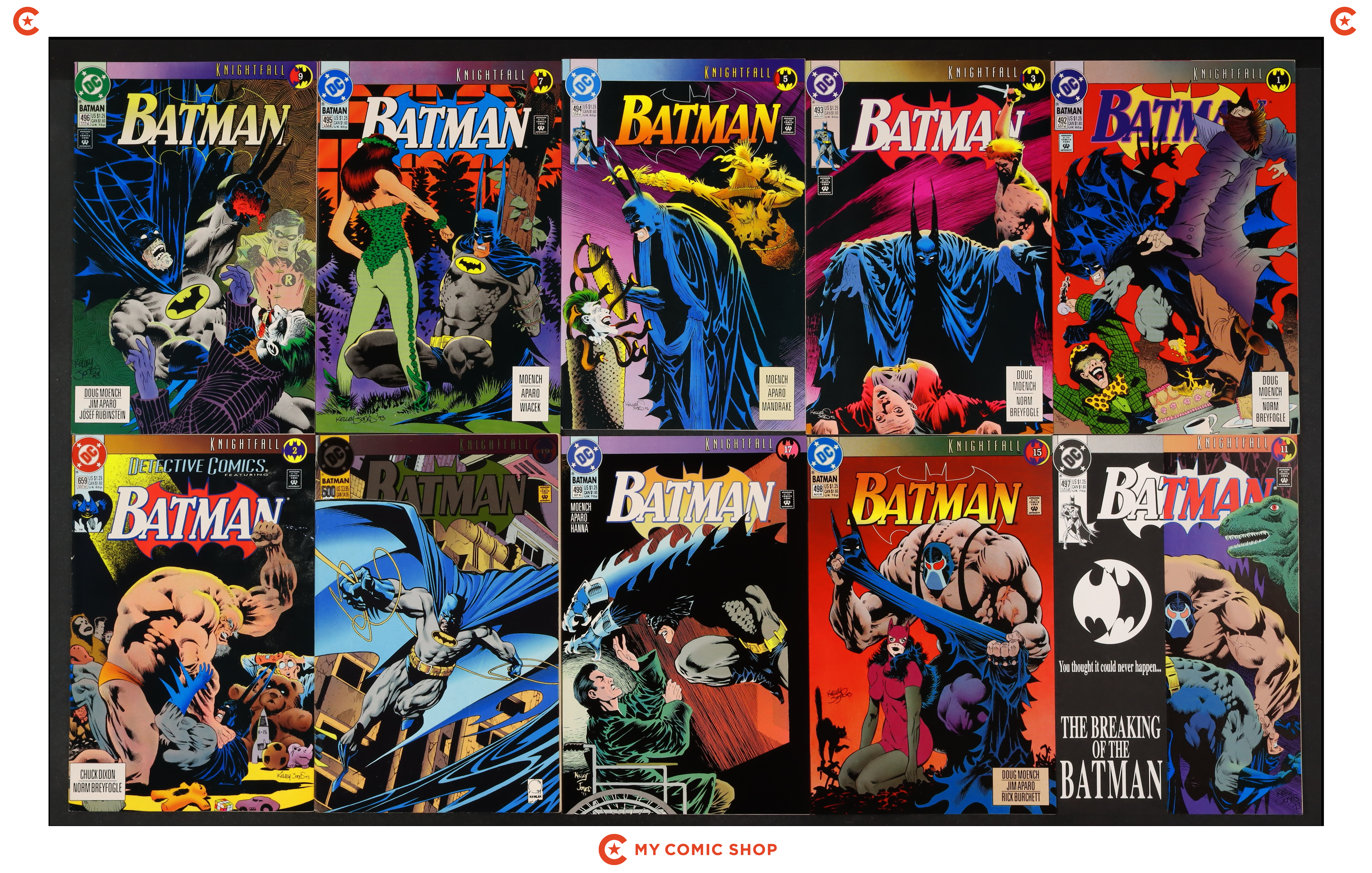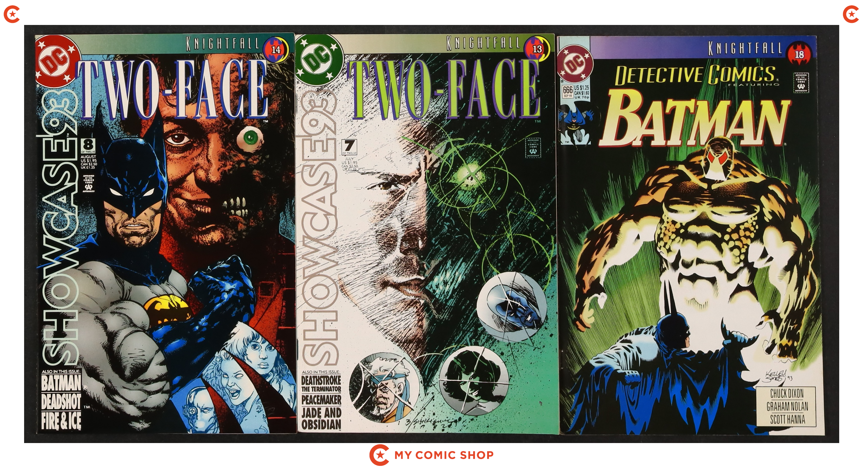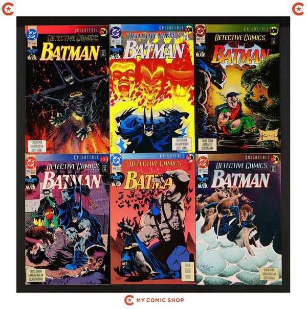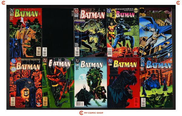 Issues 492A, 493-499, and 500B of Batman (1940); 659-666 of Detective Comics (1937 1st Series); and 7 and 8 of Showcase 93 (1993). Most will grade in the VF to FN range.
