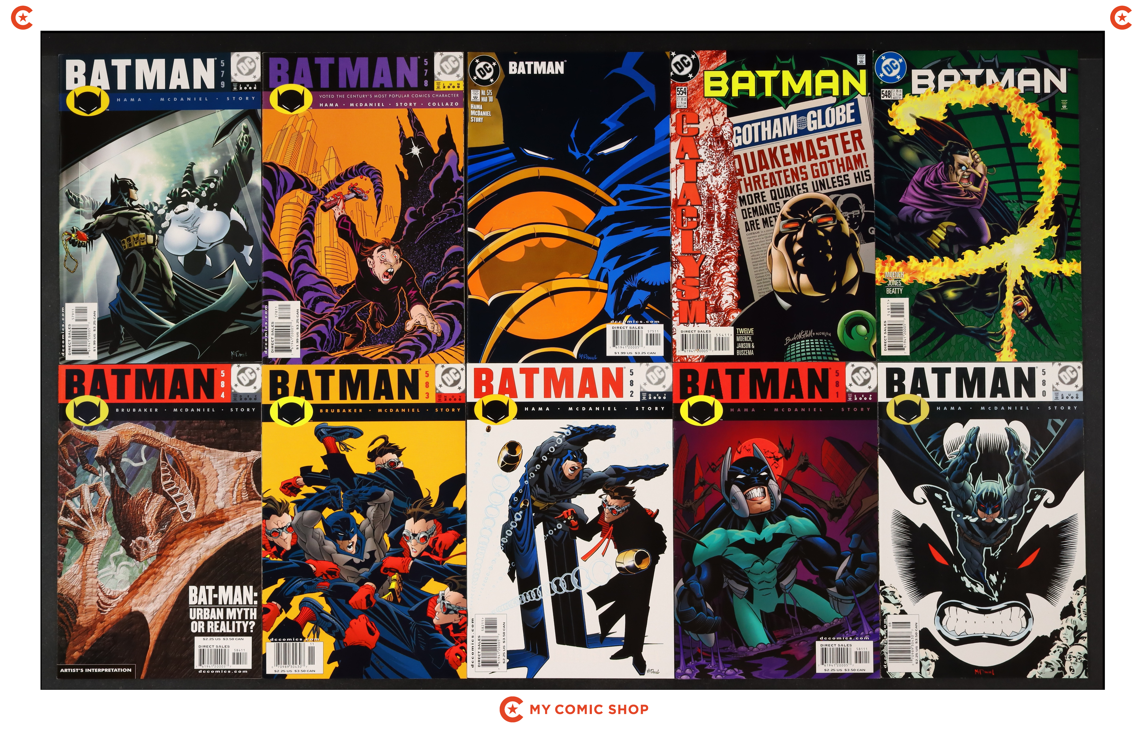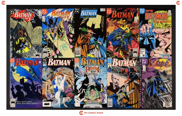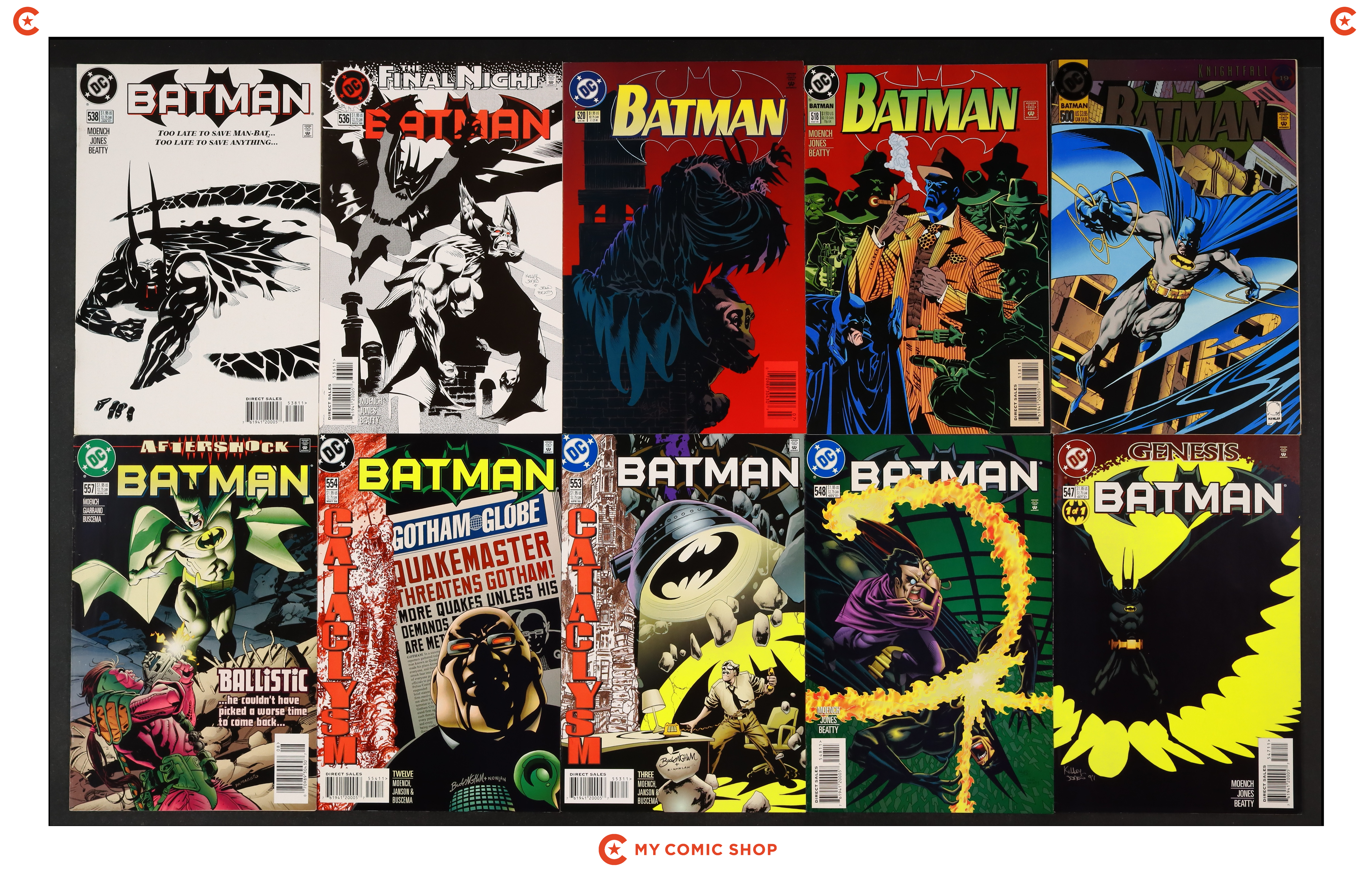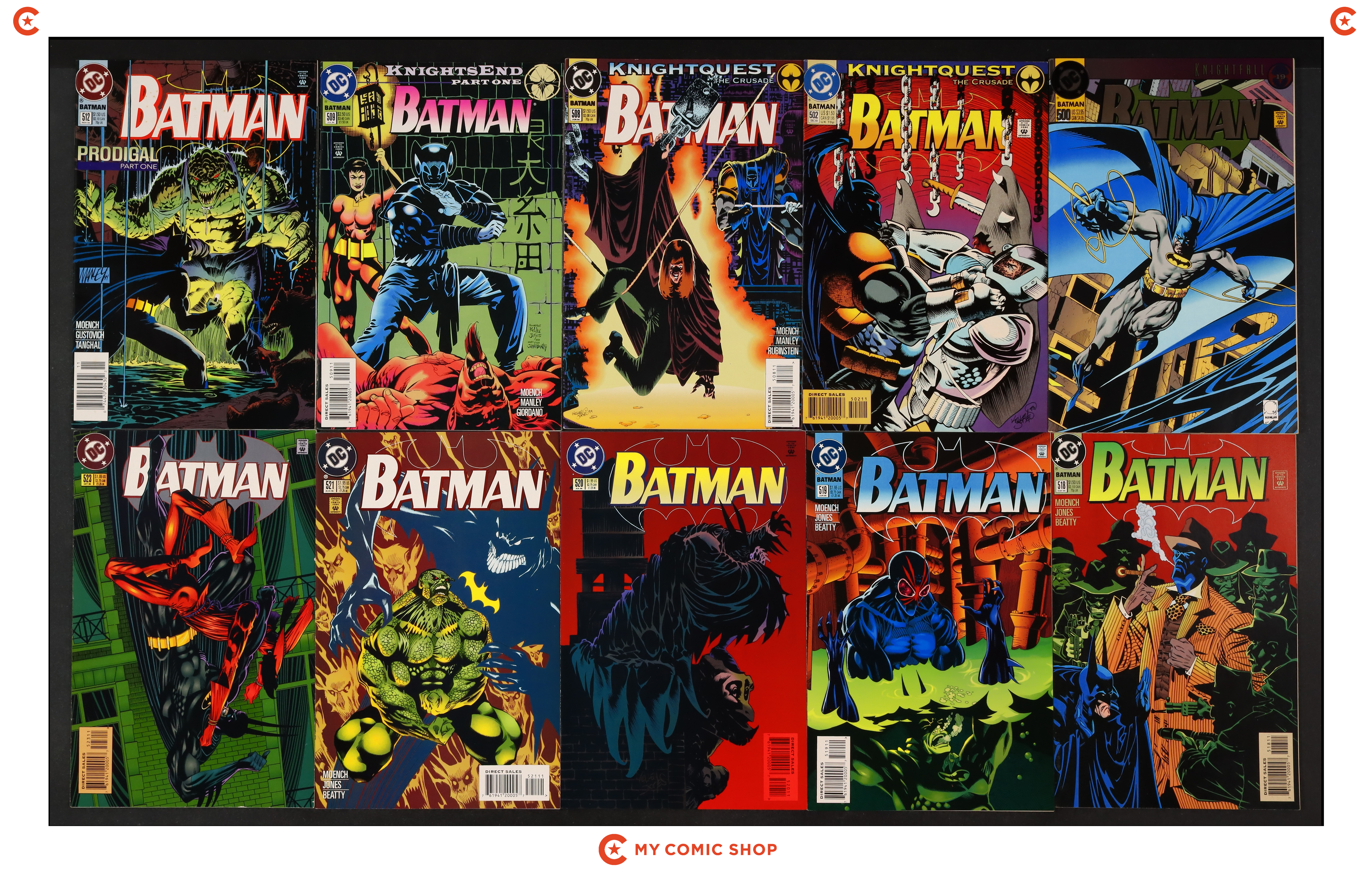 Issues 492A, 493-499, and 500B of Batman (1940); 659-666 of Detective Comics (1937 1st Series); and 7 and 8 of Showcase 93 (1993). Most will grade in the VF to FN range.