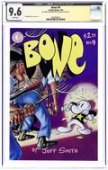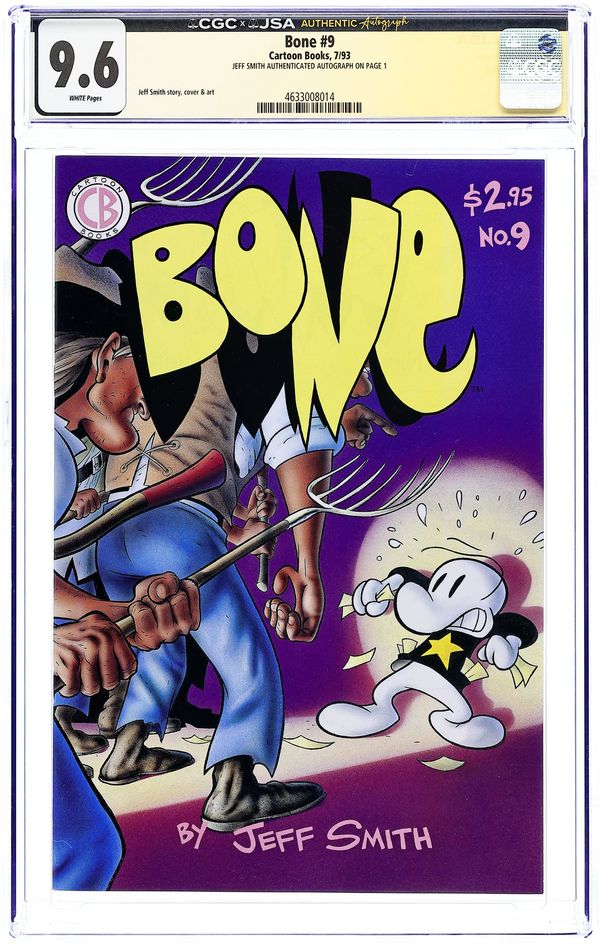 Cover art by Jeff Smith. Bone, script and art by Jeff Smith; Fone Bone, Smiley Bone and Phoney Bone are run out of Boneville and get separated in the desert; Fone Bone finds his way to the valley. 1st Fone Bone; 1st Smiley Bone; 1st Phoney Bone; 1st Red Dragon; 1st Ted the Bug; 1st Rat Creatures. 1st printing ONLY! Cartoon Books #1-20, Image books #21-27, Cartoon Books #28 and up. This is a first printing. Most issues from #1-12, and possible some beyond, have been reprinted. Reprints may be identified by a 2nd, 3rd, 4th, 5th, etc. printing notice inside the comic. 28 pgs. $2.95. Cover price $2.95.