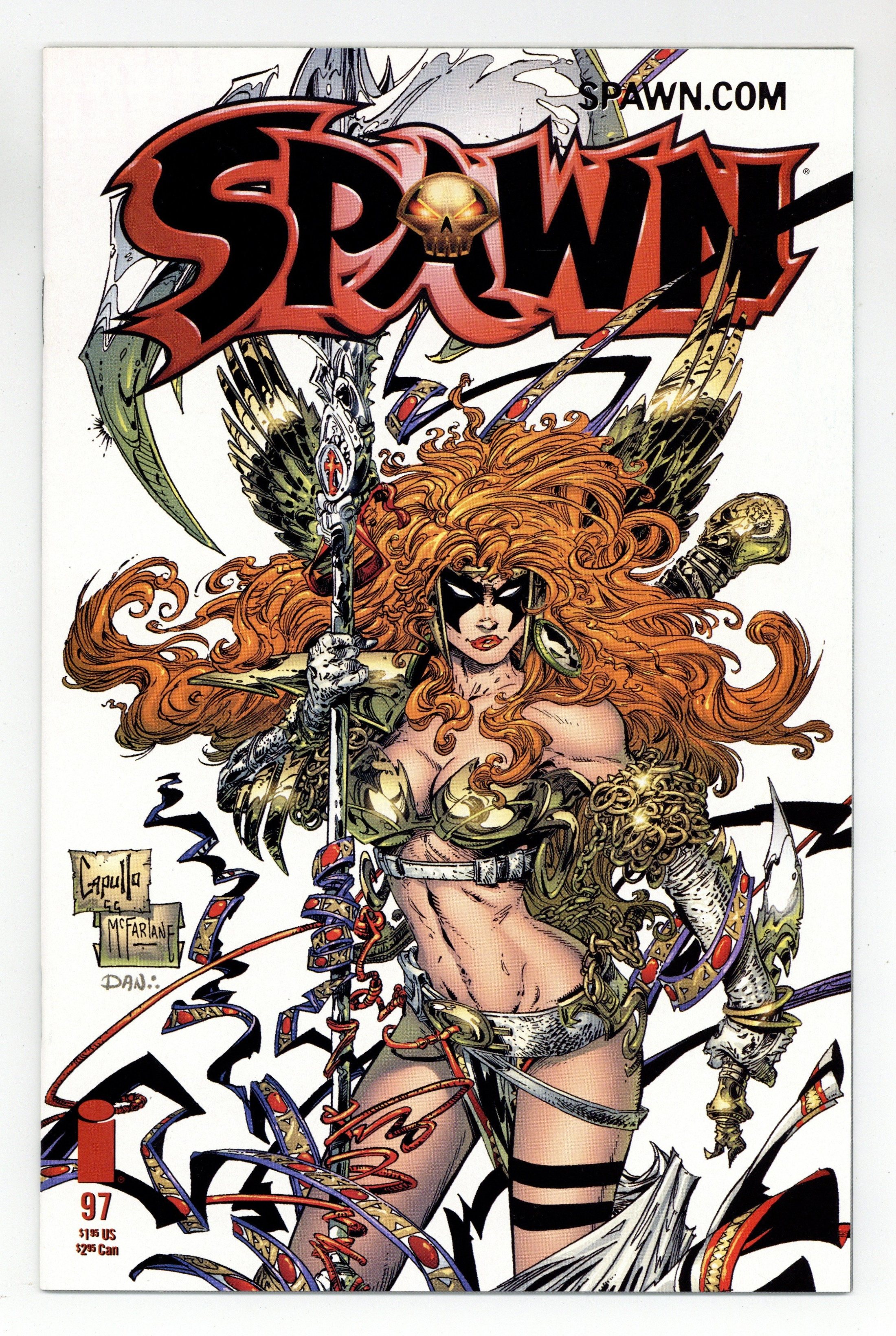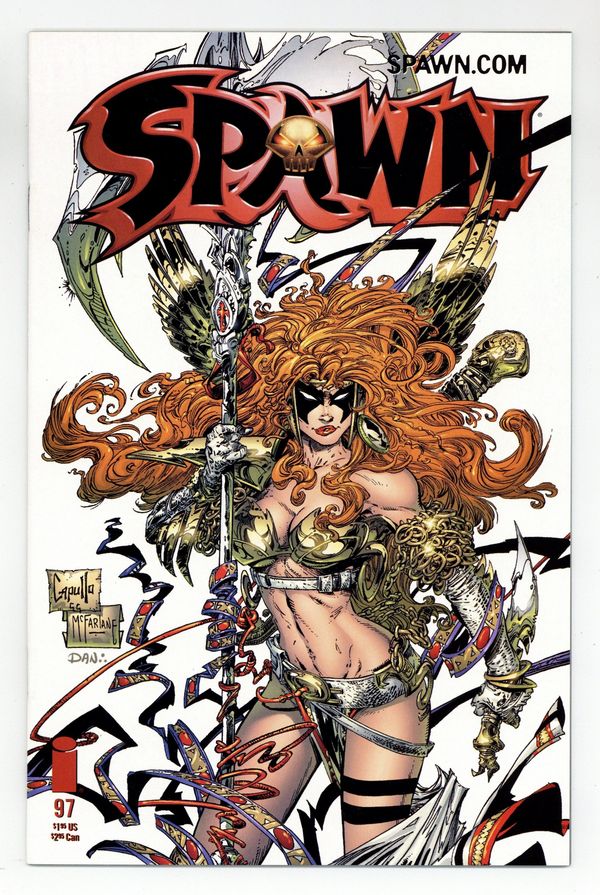 Starts Jan 19 Mike Mignola Cover. Story by Todd McFarlane and Brian Holguin Pencils by Greg Capullo Inks by Danny Miki Color by Brian Haberlin SHE DIES?This is it! Spawn is the first Image Comic to reach its 100th issue! As Heaven and Hell stand poised on the brink of total war with only Spawn between them-"She Dies"-but who is "she?" Is it Wanda? Cyan? Angela?Tiffany? Granny Blake? This issue has it all: death, birth and other startling revelations and conclusions as Spawn faces off with his greatest adversary-Angela theHunter of Hellspawns. Spawn will be forced to make the single most important decision of his existence since the day he gave his pledge to Malebolgia ? at stake will be nothing less than the future fate of his mortal soul. FC 48 pages Cover price $4.95.