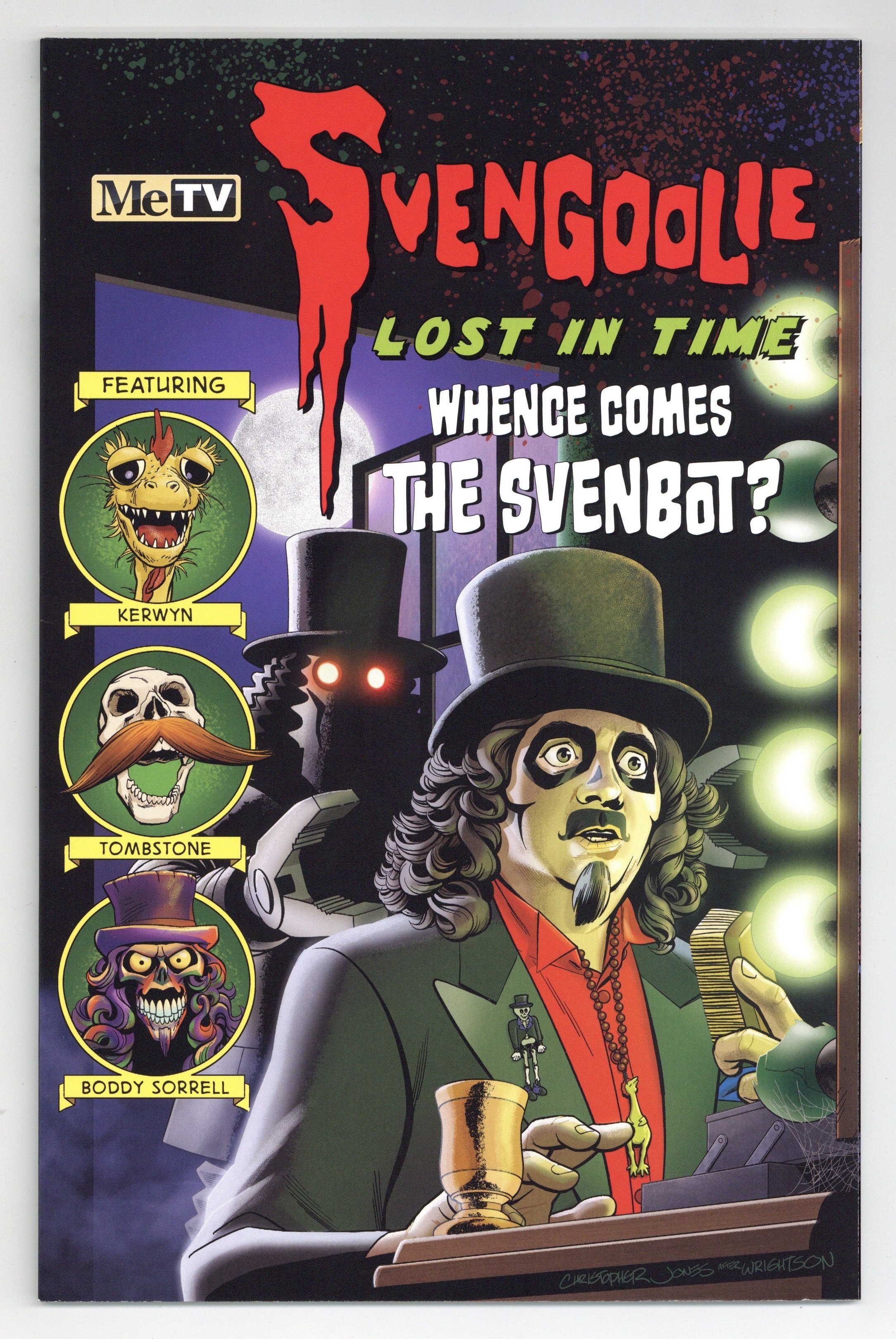 Starts Jan 26 Written by Rich Koz & Various. Art by Chris Jones & Various. Cover by Chris Jones. In this first of two specials, MeTV sensation Svengoolie appears in his first full length comic book feature, as the evil Svenbot goes to the past to undo Svengoolie's future. Learn the secrets behind Sven, and his crazy cast of friends, Boddy Sorrell, Tombstone and Kerwyn as told by the show's creators Rich (Svengoolie) Koz, Jim Roche and Chris Faulkner. Buy this at your local store and remember, No Personal Checks! 48 pages, full color. Cover price $7.99.